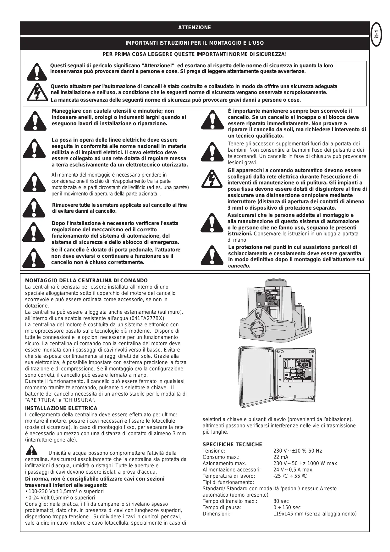 La commande peut aussi être montée en extérieur (au mur) dans un boîtier étanche (041FA277BX). La commande du moteur comporte un système électronique à microprocesseur de la technologie la plus moderne. Elle possède toutes les options de raccordement et fonctions nécessaires pour un fonctionnement sûr. Le boîtier de la commande avec commande du moteur doit être monté de sorte que les presse-étoupes soient orientées vers le bas. Il ne doit pas être exposé de manière prolongée aux rayons du soleil. La force de traction et de pression peut être réglée de manière très précise grâce au système électronique. Le portail peut être stoppé à la main, si le réglage/montage a été effectué correctement. Pendant la course, le portail peut être arrêté à tout moment par une télécommande, un bouton ou un interrupteur à clé. Le portail nécessite une butée stable pour les positions “OUVERTURE” et “FERMETURE”. INSTALLATION ELECTRIQUE Le raccordement de la commande doit être effectué en dernier, à savoir après le montage de l’entraînement, la pose des câbles requis et la fixation des barrières photoélectriques (barres palpeuses). Pour un montage fixe sur place, il faut prévoir un dispositif de coupure d’alimentation possédant un écart de contact d’au moins 3 mm (interrupteur principal). L’humidité et l’eau détruisent la commande. Veillez en toutes circonstances à ce que l’eau, l’humidité ou la saturation d’eau ne puissent pas pénétrer dans la commande. Tous les orifices et toutes les traversées de câbles doivent impérativement être fermés de manière étanche. De manière générale, il convient d’utiliser des câbles de sections minimum suivantes : • 100-230 Volt 1,5mm² ou plus • 0-24 Volt 0,5mm² ou plus Conseils : En pratique les fils de sonnette occasionnent souvent des problèmes de perte de tension importante sur les grandes longueurs de câble. Répartir les câbles pour le moteur et pour les photocellules