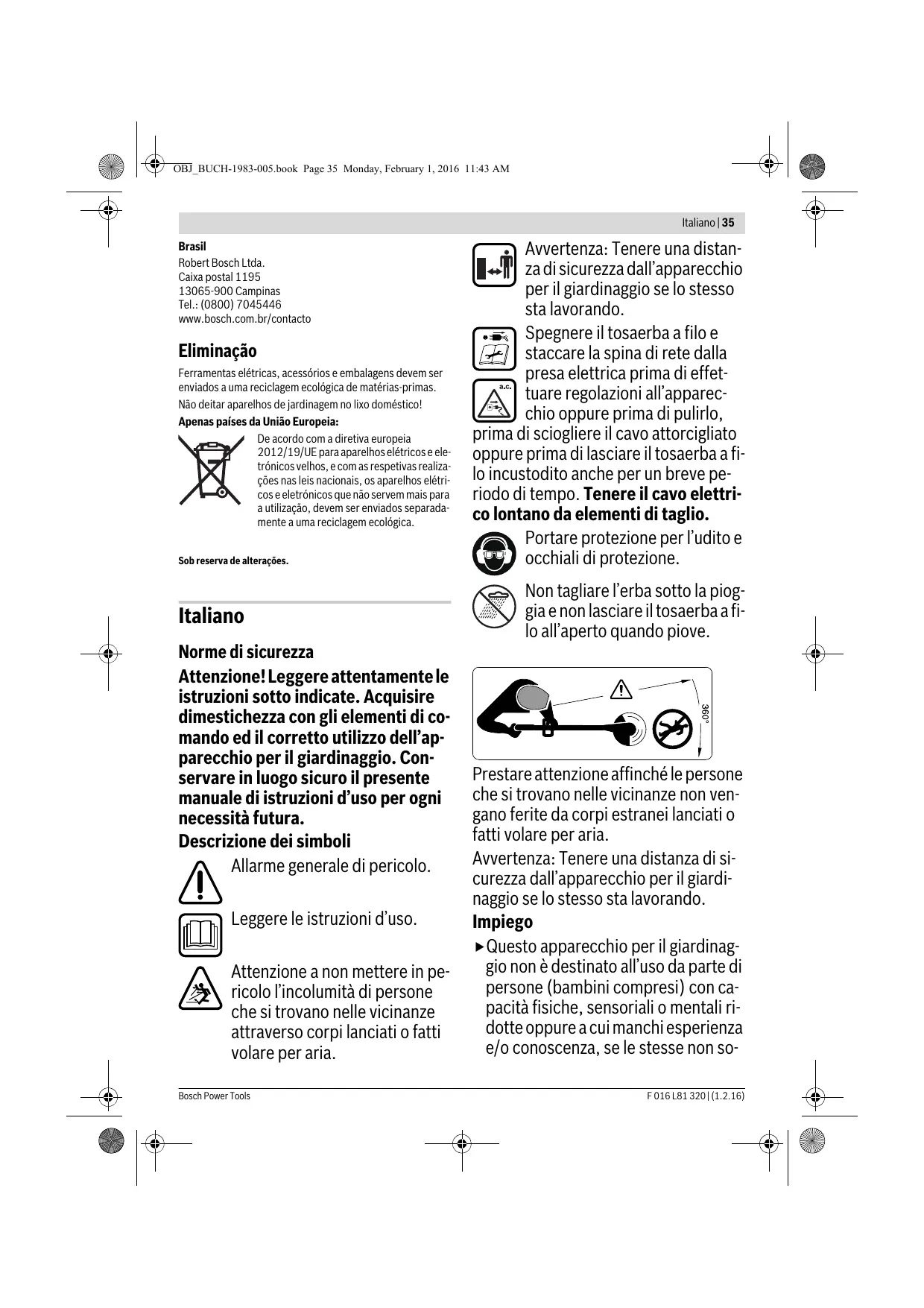 Montaggio ed uso Se la cuffia di protezione è montata, la stessa non deve essere più smontata. Non collegare l’apparecchio per il giardinaggio ad una presa di corrente fintanto che lo stesso non è completamente assemblato. Dopo il disinserimento del tosaerba, il filo da taglio continua a funzionare ancora per alcuni secondi. Prima di riaccendere nuovamente il tosaerba attendere che il motore/il filo da taglio si siano fermati completamente. Non avviare nuovamente la macchina subito dopo averla disinserita. Eliminare resti di erba dalla copertura della bobina quando viene sostituito il filo o la bobina stessa. Si consiglia l’impiego di elementi di taglio omologati dalla Bosch. In caso di altri elementi di taglio è possibile che il risultato di taglio sia differente. Prima dell’uso controllare la sede fissa della vite di fissaggio per la cuffia di protezione. L’alimentazione del filo avviene ogni volta che l’alberino si arresta (interruttore di avvio/arresto viene rilasciato); un filo troppo lungo viene tagliato quando l’apparecchio per il giardinaggio si avvia di nuovo. F 016 L81 320 | (1.2.16) dB(A)