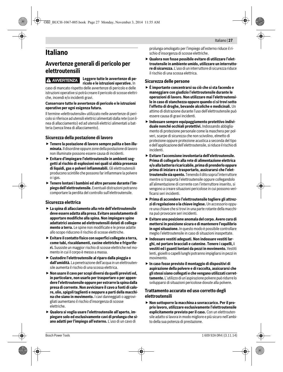 Advertencias de peligro generales para herramientas eléctricas Lea íntegramente estas advertencias de peligro e instrucciones. En caso de no atenerse a las advertencias de peligro e instrucciones siguientes, ello puede ocasionar una descarga eléctrica, un incendio y/o lesión grave. Retire las herramientas de ajuste o llaves fijas antes de conectar la herramienta eléctrica. Una herramienta de ajuste o llave fija colocada en una pieza rotante puede producir lesiones al poner a funcionar la herramienta eléctrica. Evite posturas arriesgadas. Trabaje sobre una base firme y mantenga el equilibrio en todo momento. Ello le permitirá controlar mejor la herramienta eléctrica en caso de presentarse una situación inesperada. 1 609 92A 0R4 | (3.11.14)
