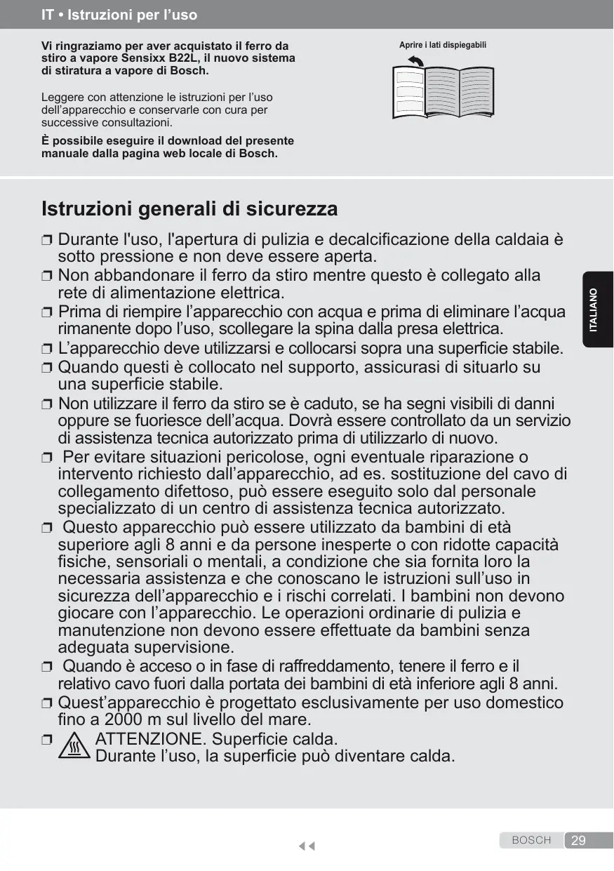 BOSCH IT • Istruzioni per l’uso Vi ringraziamo per aver acquistato il ferro da stiro a vapore Sensixx B22L, il nuovo sistema di stiratura a vapore di Bosch. Aprire i lati dispiegabili Leggere con attenzione le istruzioni per l’uso dell’apparecchio e conservarle con cura per successive consultazioni. È possibile eseguire il download del presente manuale dalla pagina web locale di Bosch. Istruzioni generali di sicurezza ❐❐ Durante l'uso, l'apertura di pulizia e decalcificazione della caldaia è BOSCH Italiano sotto pressione e non deve essere aperta. ❐❐ Non abbandonare il ferro da stiro mentre questo è collegato alla rete di alimentazione elettrica. ❐❐ Prima di riempire l’apparecchio con acqua e prima di eliminare l’acqua rimanente dopo l’uso, scollegare la spina dalla presa elettrica. ❐❐ L’apparecchio deve utilizzarsi e collocarsi sopra una superficie stabile. ❐❐ Quando questi è collocato nel supporto, assicurasi di situarlo su una superficie stabile. ❐❐ Non utilizzare il ferro da stiro se è caduto, se ha segni visibili di danni oppure se fuoriesce dell’acqua. Dovrà essere controllato da un servizio di assistenza tecnica autorizzato prima di utilizzarlo di nuovo. ❐❐ Per evitare situazioni pericolose, ogni eventuale riparazione o intervento richiesto dall’apparecchio, ad es. sostituzione del cavo di collegamento difettoso, può essere eseguito solo dal personale specializzato di un centro di assistenza tecnica autorizzato. ❐❐ Questo apparecchio può essere utilizzato da bambini di età superiore agli 8 anni e da persone inesperte o con ridotte capacità fisiche, sensoriali o mentali, a condizione che sia fornita loro la necessaria assistenza e che conoscano le istruzioni sull’uso in sicurezza dell’apparecchio e i rischi correlati. I bambini non devono giocare con l’apparecchio. Le operazioni ordinarie di pulizia e manutenzione non devono essere effettuate da bambini senza adeguata supervisione. ❐❐ Quando è acceso o in fase di raffreddamento, tenere il ferro e il relativo cavo fuori dalla portata dei bambini di età inferiore agli 8 anni. ❐❐ Quest’apparecchio è progettato esclusivamente per uso domestico fino a 2000 m sul livello del mare.
