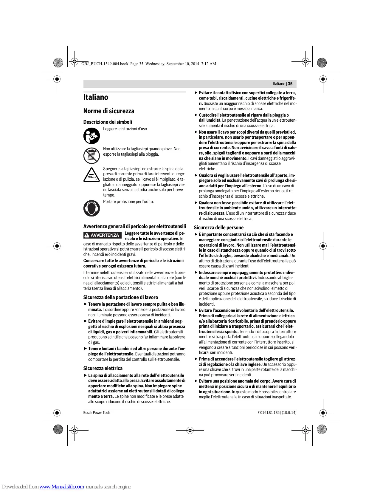Indicações de trabalho Função de serra Apesar do espaço entre os dentes permitir cortes em galhos com um Ø de até 26/34 mm, a ponta da barra de lâminas foi projectada para cortes com um Ø de até 32/38 mm. Bosch Power Tools Downloaded from www.Manualslib.com manuals search engine F 016 L81 185 | (10.9.14) OBJ_BUCH-1549-004.book Page 34 Wednesday, September 10, 2014 7:12 AM 34 | Português Busca de erros Sintomas Possível causa A tesoura de sebes não funciona Falta tensão de rede Solução Controlar e ligar Tomada de rede eléctrica com defeito Utilizar uma outra tomada A linha de conexão fixa está danificada Controlar cuidadosamente a linha de conexão; entrar em contacto com o serviço pós-venda em caso de ter que ser substituído Cabo de extensão separado danificado Controlar o cabo de extensão e substituir se estiver danificado O fusível foi accionado Substituir o fusível A tesoura de sebes funcio- A linha de conexão fixa está danificada na com interrupções Controlar cuidadosamente a linha de conexão; entrar em contacto com o serviço pós-venda em caso de ter que ser substituído Cabo de extensão separado danificado Controlar o cabo de extensão e substituir se estiver danificado A cablagem interna do aparelho de jardinagem Dirija-se a uma oficina de serviço pós-venda está com defeito Interruptor de ligar-desligar com defeito Dirija-se a uma oficina de serviço pós-venda O motor funciona mas a lâ- Erro interno mina permanece parada Dirija-se a uma oficina de serviço pós-venda As lâminas tornam-se quentes As lâminas estão embotadas Deixar a barra de lâmina ser afiada A lâmina têm mossas Deixar a barra de lâmina ser controlada Demasiada fricção devido à falta e lubrificação Pulverizar com óleo de lubrificação Fortes vibrações/ruídos Aparelho de jardinagem com defeito Serviço pós-venda e consultoria de aplicação www.bosch-garden.com Para todas as questões e encomendas de peças sobressalentas é imprescindível indicar o número de produto de 10 dígitos, como consta na placa de características da electro-serra. Portugal Robert Bosch LDA Avenida Infante D. Henrique Lotes 2E – 3E 1800 Lisboa Para efectuar o seu pedido online de peças entre na página www.ferramentasbosch.com. Tel.: 21 8500000 Fax: 21 8511096 Dirija-se a uma oficina de serviço pós-venda Brasil Robert Bosch Ltda. Caixa postal 1195 13065-900 Campinas Tel.: (0800) 7045446 www.bosch.com.br/contacto Eliminação Ferramentas eléctricas, acessórios e embalagens devem ser enviados a uma reciclagem ecológica de matérias primas. Não deitar ferramentas eléctricas no lixo doméstico! Apenas países da União Europeia: De acordo com a directiva europeia 2012/19/UE para aparelhos eléctricos e electrónicos velhos, e com as respectivas realizações nas leis nacionais, as ferramentas eléctricas que não servem mais para a utilização, devem ser enviadas separadamente a uma reciclagem ecológica. Sob reserva de alterações. F 016 L81 185 | (10.9.14) Downloaded from www.Manualslib.com manuals search engine Bosch Power Tools OBJ_BUCH-1549-004.book Page 35 Wednesday, September 10, 2014 7:12 AM Italiano | 35 Italiano Norme di sicurezza Descrizione dei simboli Leggere le istruzioni d’uso. Non utilizzare la tagliasiepi quando piove. Non esporre la tagliasiepi alla pioggia. Spegnere la tagliasiepi ed estrarre la spina dalla presa di corrente prima di fare interventi di regolazione o di pulizia, se il cavo si è impigliato, è tagliato o danneggiato, oppure se la tagliasiepi viene lasciata senza custodia anche solo per breve tempo. Portare protezione per l’udito. Evitare il contatto fisico con superfici collegate a terra, come tubi, riscaldamenti, cucine elettriche e frigoriferi. Sussiste un maggior rischio di scosse elettriche nel momento in cui il corpo è messo a massa. Custodire l’elettroutensile al riparo dalla pioggia o dall’umidità. La penetrazione dell’acqua in un elettroutensile aumenta il rischio di una scossa elettrica. Non usare il cavo per scopi diversi da quelli previsti ed, in particolare, non usarlo per trasportare o per appendere l’elettroutensile oppure per estrarre la spina dalla presa di corrente. Non avvicinare il cavo a fonti di calore, olio, spigoli taglienti e neppure a parti della macchina che siano in movimento. I cavi danneggiati o aggrovigliati aumentano il rischio d’insorgenza di scosse elettriche. Qualora si voglia usare l’elettroutensile all’aperto, impiegare solo ed esclusivamente cavi di prolunga che siano adatti per l’impiego all’esterno. L’uso di un cavo di prolunga omologato per l’impiego all’esterno riduce il rischio d’insorgenza di scosse elettriche. Qualora non fosse possibile evitare di utilizzare l’elettroutensile in ambiente umido, utilizzare un interruttore di sicurezza. L’uso di un interruttore di sicurezza riduce il rischio di una scossa elettrica. Avvertenze generali di pericolo per elettroutensili Sicurezza delle persone Leggere tutte le avvertenze di pericolo e le istruzioni operative. In caso di mancato rispetto delle avvertenze di pericolo e delle istruzioni operative si potrà creare il pericolo di scosse elettriche, incendi e/o incidenti gravi. Conservare tutte le avvertenze di pericolo e le istruzioni operative per ogni esigenza futura. Il termine «elettroutensile» utilizzato nelle avvertenze di pericolo si riferisce ad utensili elettrici alimentati dalla rete (con linea di allacciamento) ed ad utensili elettrici alimentati a batteria (senza linea di allacciamento). È importante concentrarsi su ciò che si sta facendo e maneggiare con giudizio l’elettroutensile durante le operazioni di lavoro. Non utilizzare mai l’elettroutensile in caso di stanchezza oppure quando ci si trovi sotto l’effetto di droghe, bevande alcoliche e medicinali. Un attimo di distrazione durante l’uso dell’elettroutensile può essere causa di gravi incidenti. Indossare sempre equipaggiamento protettivo in