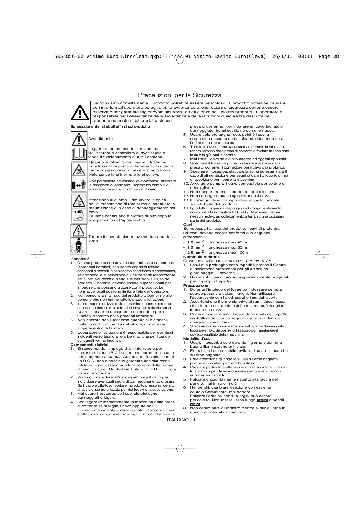 08:11 Page 37 5054856-02 Visimo Euro Kingclean.qxp:???????-01 Visimo-Easimo Euro(Cleva) 26/1/11 Precauzioni per la Sicurezza Se non usato correttamente il prodotto potrebbe essere pericoloso! Il prodotto potrebbe causare seri infortuni all’operatore ed agli altri, le avvertenze e le istruzioni di sicurezza devono essere osservate per garantire ragionevole sicurezza ed efficienza nell’uso del prodotto. L’operatore è responsabile per l’osservanza delle avvertenze e delle istruzioni di sicurezza descritte nel presente manuale e sul prodotto stesso. Spiegazione dei simboli affissi sul prodotto Avvertimento Leggere attentamente le istruzioni per lʼutilizzatore e controllare di aver capito a fondo il funzionamento di tutti i comandi. Quando si falcia lʼerba, tenere il tosaerba parallelo alla superficie da falciare, in quanto pietre o sassi possono essere scagliati con violenza se lo si inclina o lo si solleva. Non permettere ad estranei di avvicinarsi. Arrestare la macchina quando terzi, soprattutto bambini o animali si trovano entro lʼarea da falciare. Attenzione alle lame – rimuovere la spina dallʼalimentazione di rete prima di effettuare la mauntezione o in caso di danneggiamento del cavo. Le lame continuano a ruotare subito dopo lo spegnimento dellʼapparecchio. Tenere il cavo di alimentazione lontano dalla lama. Generalità