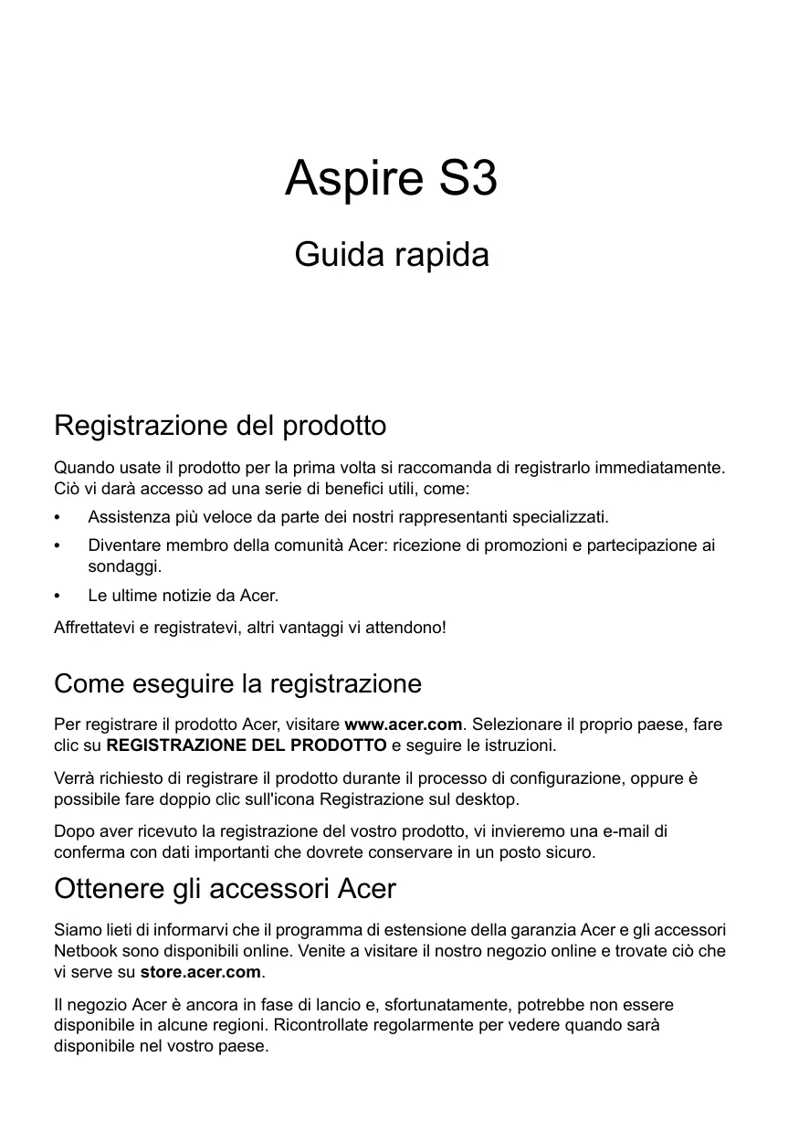 Per altre nozioni su come il vostro computer può aiutarvi a divertare ancorta più produttivi, consultate il Manuale dell'utente di Aspire S3. Il Manuale dell'utente di Aspire S3 contiene informazioni utili relative al nuovo computer. Copre gli argomenti base come ad esempio l'uso della tastiera, audio, ecc.