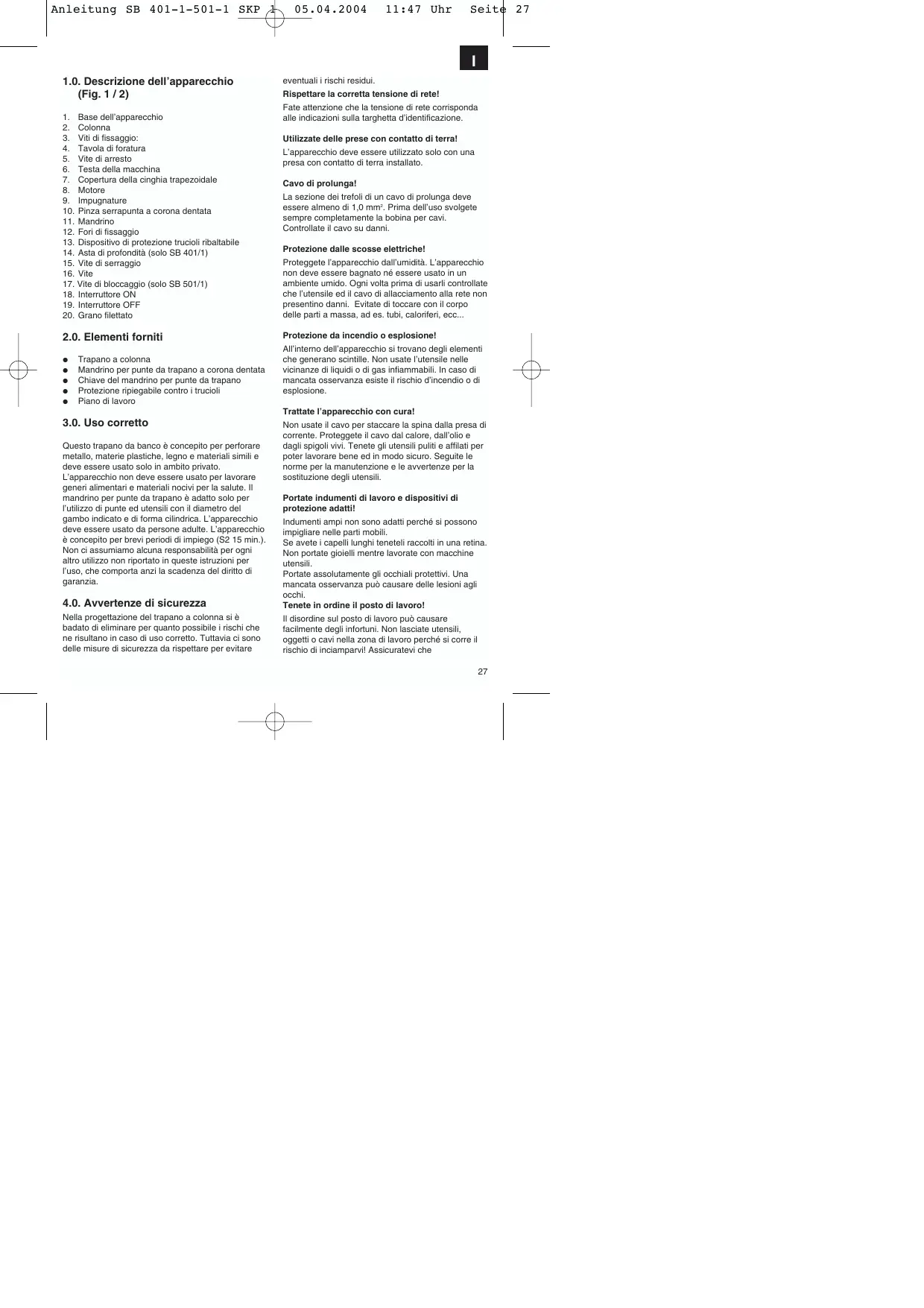 Cambiamenti tecnici ed ottici possono venire eseguiti senza preavviso nell’ambito di un ulteriore sviluppo. Non ci è possibile quindi garantire le misure, le avvertenze e le indicazioni di queste istruzioni per l’uso. La vibrazione mano-braccio è solitamente inferiore a 2,5 m/s2. Il rumore e le vibrazioni sono stati rilevati secondo i requisiti della norma EN61029-1. 6.0. Struttura 6.1. Montaggio (Fig. 1-4) L’elettroutensile viene montato come segue Installare il piede dell’apparecchio (1) Fissate la flangia di fissaggio con la colonna (2) tramite tre viti (3) e rondelle sul piede dell’utensile (1). Spingete la tavola di foratura (4) con supporto tavola verso la colonna (2) (fig. 4). Bloccate la tavola di foratura con la vite di arresto (5) nella posizione desiderata. Posizionate la testa del trapano (6) con la copertura della cinghia trapezoidale (7) ed il motore (8) sulla colonna del trapano e fissatela con la vite di fermo senza testa (20). Avvitate le tre impugnature (9) sulla crociera di avanzamento. Avvertenza: Tutte le parti non rivestite sono ingrassate per proteggerle dalla corrosione. Prima di mettere la pinza serrapunta (10) sul mandrino (11), le due parti devono venire sgrassate completamente usando un solvente biologico, per garantire un’ottimale trasmissione della forza. Posizionare la pinza serrapunta sul mandrino. 6.2. Installazione della macchina (Fig. 1/2) Prima della messa in servizio il trapano deve venire montato solidamente sul piano di lavoro di un robusto banco di lavoro. Usate a proposito i due fori di fissaggio (12) nella piastra del fondo. Fate attenzione che la macchina sia liberamente accessibile per l’esercizio e per lavori di impostazione e di manutenzione. Avvertenza: Le viti di fissaggio devono venire avvitate in maniera che la piastra del fondo non sia sottoposta a torsione o si deformi. In caso di sollecitazione eccessiva c’è il pericolo che si rompa. 6.3. Dispositivo di protezione trucioli ribaltabile (Fig. 5) Svitate le tre viti con intaglio a croce (21). Spingete la copertura trasparente (23) nella fessura del telaio di alloggio rosso (24) e fissatela di nuovo con le viti con intaglio a croce (21). L’altezza della copertura (23) si può regolare in continuo e fissare con le due viti ad alette (22). Per sostituire il trapano si può ribaltare verso l’alto la protezione dai trucioli (13), ma prima di riaccendere la macchina la protezione (13) deve venire riportata nella sua posizione di partenza. 6.4. Da tenere presente prima della messa in esercizio Fate attenzione che la tensione della presa di rete corrisponda alla targhetta d’identificazione. Collegate la macchina solo ad una presa che abbia un contatto di terra installato in modo corretto. Il trapano da banco è dotato di un interruttore di minima tensione che protegge l’utilizzatore dal riavvio improvviso dopo una caduta di tensione. In questo caso la macchina deve venire accesa di nuovo. 7.0. Esercizio Quando lavorate con il trapano da banco portate degli indumenti protettivi adatti ed aderenti al corpo. Portate sempre gli occhiali protettivi! In caso di capelli lunghi portate sempre una retina (oppure un berretto)! 7.1. Informazioni generali (Fig. 3) Per accendere l’elettroutensile premete l’interruttore verde „I“ (18) e questo si avvia. Per spegnerlo premete il pulsante rosso „O“ (19) e l’utensile si spegne. Fate attenzione a non sottoporre l’utensile ad un carico eccessivo. Se il rumore del motore diminuisce mentre è in funzione, ciò significa che il motore viene sottoposto ad carico eccessivo. Non sottoponete l’apparecchio ad un carico tale da provocare l’arresto del motore. L’apparecchio è concepito per l’esercizio continuo con carico intermittente (S2 15 min.). La macchina può venire utilizzata a pieno carico per un massimo di1 5 minuti, poi deve funzionare a vuoto per 15 minuti. In questo modo si evita il surriscaldamento del motore. 7.2. Inserimento della punta (Fig. 1/2) Fate assolutamente attenzione che durante la
