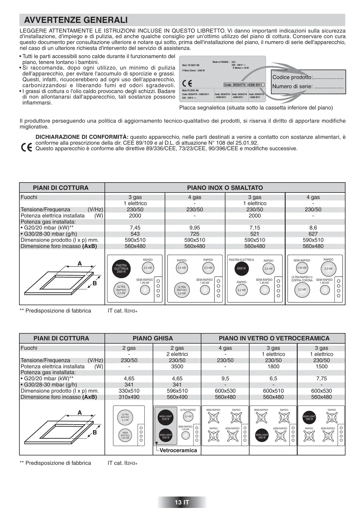 AVVERTENZE GENERALI LEGGERE ATTENTAMENTE LE ISTRUZIONI INCLUSE IN QUESTO LIBRETTO. Vi danno importanti indicazioni sulla sicurezza d'installazione, d'impiego e di pulizia, ed anche qualche consiglio per un'ottimo utilizzo del piano di cottura. Conservare con cura questo documento per consultazione ulteriore e notare qui sotto, prima dell'installazione del piano, il numero di serie dell'apparecchio, nel caso di un ulteriore richiesta d'intervento del servizio di assistenza. - Tutti le parti accessibili sono calde durante il funzionamento del & à piano, tenere lontano i bambini. none ae +Si raccomanda, dopo ogni utilizzo, un minimo di pulizia oo = 30W dell'apparecchio, per evitare l'accumulo di sporcizie e grassi. Questi, infatti, ricuocerebbero ad ogni uso dell'apparecchio, carbonizzandosi e liberando fumi ed odori sgradevoli. ce - 1 grassi di cottura o l'olio caldo provocano degli schizzi. Badare | mræam di non allontanarsi dall'apparecchio, tali sostanze possono FT omsostr “aostt |uosrt infiammarsi. Numero di serie: Placca segnaletica (situata sotto la cassetta inferiore del piano) Il produttore perseguendo una politica di aggiornamento tecnico-qualitativo dei prodotti, si riserva il diritto di apportare modifiche migliorative. DICHIARAZIONE DI CONFORMITÀ: questo apparecchio, nelle parti destinati a venire a contatto con sostanze alimentari, à conforme alla prescrizione della dir. CEE 89/109 e al D.L. di attuazione N° 108 del 25.01.92. € € Questo apparecchio à conforme alle direttive 89/336/CEE, 73/23/CEE, 90/396/CEE e modifiche successive. PIANI DI COTTURA PIANO INOX O SMALTATO Fuochi 3 gas 4 gas 3 gas 4 gas 1 elettrico - 1 elettrico - Tensione/Frequenza (V/Hz) 230/50 230/50 230/50 230/50 Potenza elettrica installata (W) 2000 - 2000 - Potenza gas installata: + G20/20 mbar (KW)** 7,45 9,95 7,15 8,6 + G30/28-30 mbar (g/h) 543 725 521 627 Dimensione prodotto (1x p) mm. 590x510 590x510 590x510 590x510 Dimensione foro incasso (AxB) 560x480 560x480 560x480 560x480 Rappo Rago Rae00 PSTRAELETIRCA Rapo sewreno RAPDO