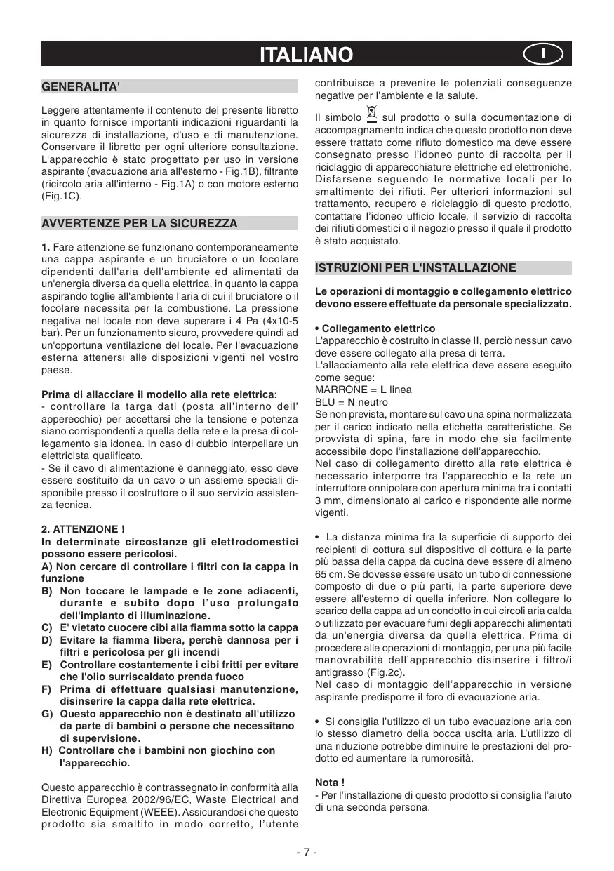contribuisce a prevenire le potenziali conseguenze negative per l’ambiente e la salute. GENERALITA' Leggere attentamente il contenuto del presente libretto in quanto fornisce importanti indicazioni riguardanti la sicurezza di installazione, d'uso e di manutenzione. Conservare il libretto per ogni ulteriore consultazione. L'apparecchio è stato progettato per uso in versione aspirante (evacuazione aria all'esterno - Fig.1B), filtrante (ricircolo aria all'interno - Fig.1A) o con motore esterno (Fig.1C).