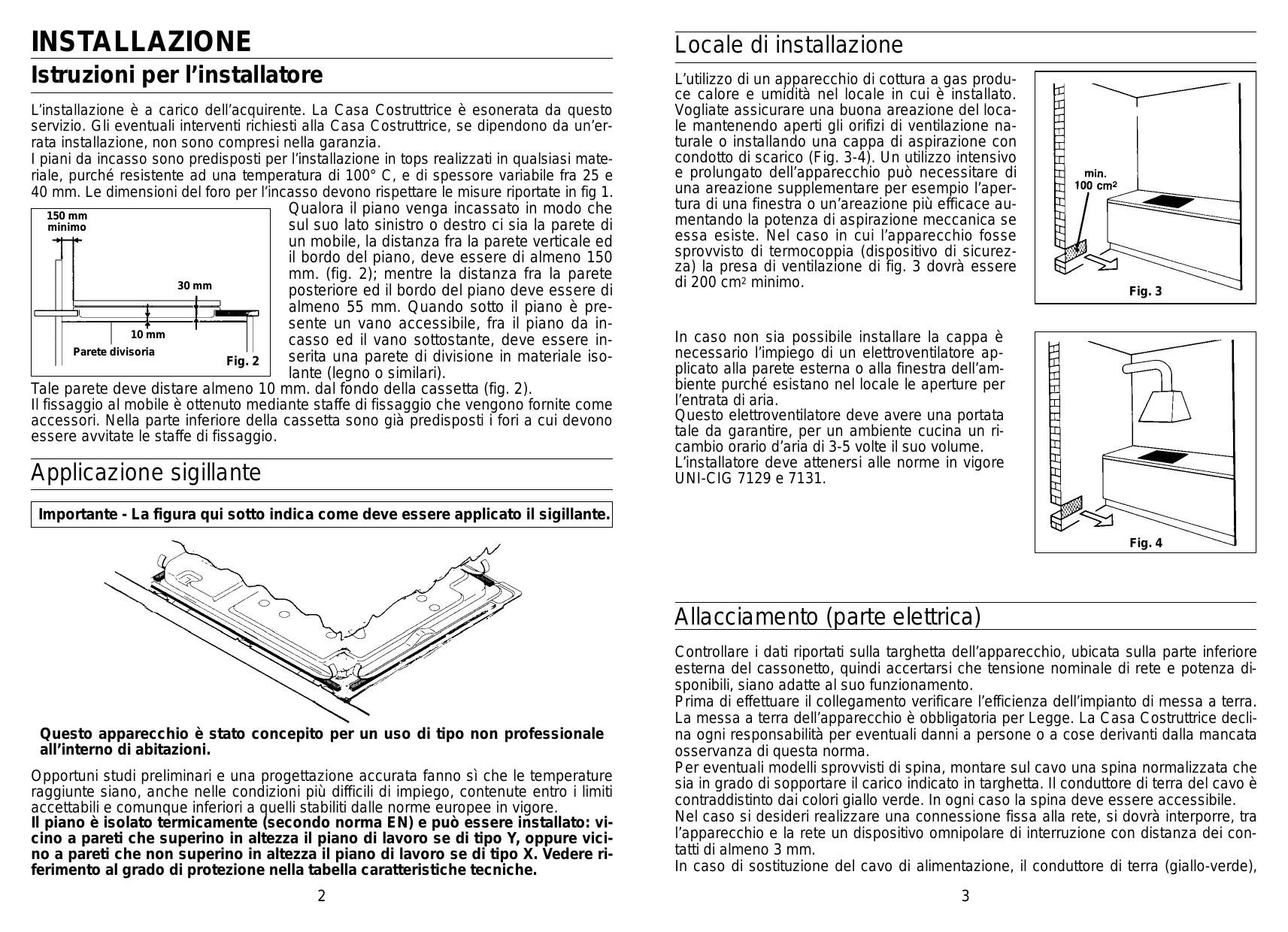L'utilizzo di un appearecchio di cottura a gas produce calore e umidità nel locale in cui è installato. Vogliate assicurare una buona areazione del locale mantenendo aperti gli orifizi di ventilazione naturale o installando una cappa di aspirazione con condotto di scarico (Fig. 3-4). Un utilizzo intensivo e prolongato dell'apparecchio può necessitarde una areazione supplementare per esempio l'aper-tura di una finestra o un'areazione più efficace augmentando la potenza di aspirazione meccanica seessa esiste. Nel caso in cui l'apparecchio fosse sprovvisto di termocoppia (dispositivo di sicurezza) la presa di ventilazione di fig. 3 dovrà essere di 200~cm^2 minimo.