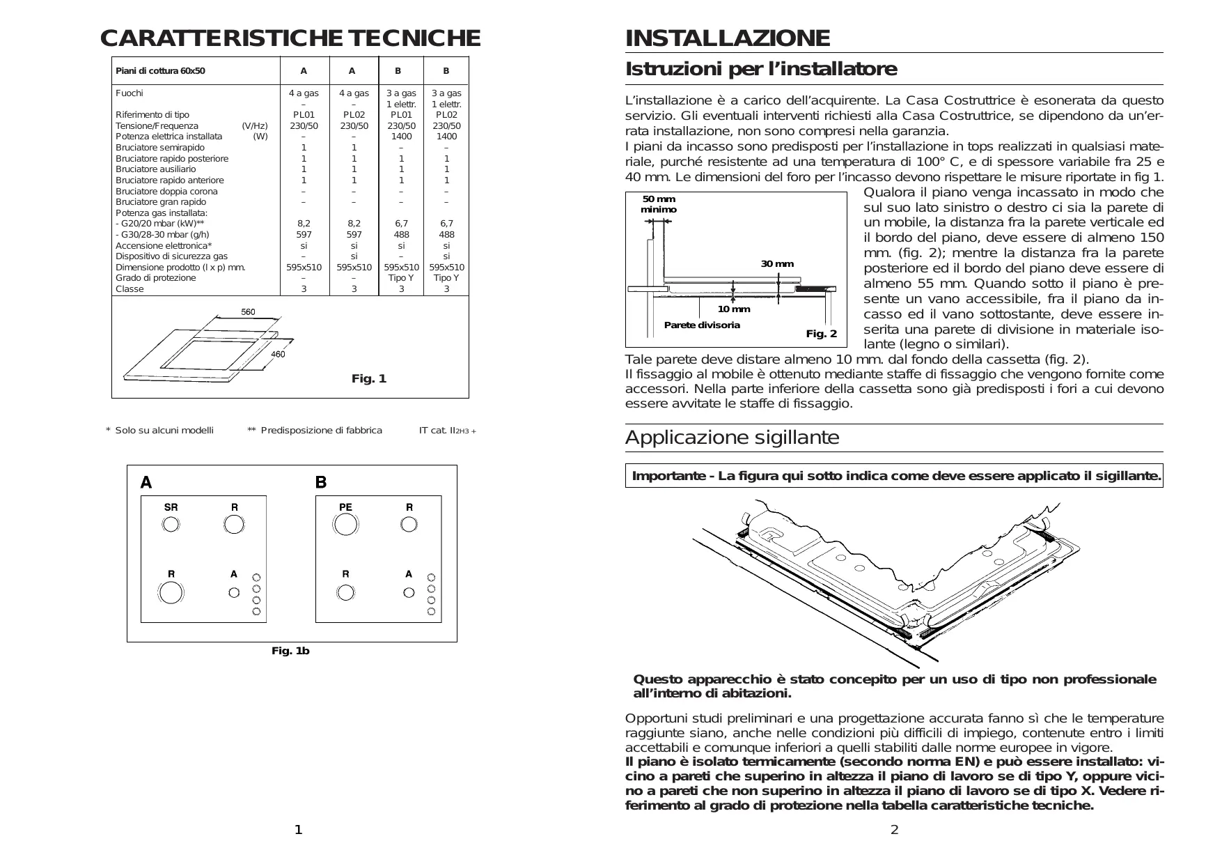 - Solo su alcuni modelli ** Predisposizione di fabbrica IT cat. II2H3 + INSTALLAZIONE Istruzioni per l’installatore L’installazione è a carico dell’acquirente. La Casa Costruttrice è esonerata da questo servizio. Gli eventuali interventi richiesti alla Casa Costruttrice, se dipendono da un’errata installazione, non sono compresi nella garanzia. I piani da incasso sono predisposti per l’installazione in tops realizzati in qualsiasi materiale, purché resistente ad una temperatura di 100° C, e di spessore variabile fra 25 e 40 mm. Le dimensioni del foro per l’incasso devono rispettare le misure riportate in fig 1. Qualora il piano venga incassato in modo che 50 mm sul suo lato sinistro o destro ci sia la parete di minimo un mobile, la distanza fra la parete verticale ed il bordo del piano, deve essere di almeno 150 mm. (fig. 2); mentre la distanza fra la parete 30 mm posteriore ed il bordo del piano deve essere di almeno 55 mm. Quando sotto il piano è presente un vano accessibile, fra il piano da in10 mm casso ed il vano sottostante, deve essere inParete divisoria serita una parete di divisione in materiale isoFig. 2 lante (legno o similari). Tale parete deve distare almeno 10 mm. dal fondo della cassetta (fig. 2). Il fissaggio al mobile è ottenuto mediante staffe di fissaggio che vengono fornite come accessori. Nella parte inferiore della cassetta sono già predisposti i fori a cui devono essere avvitate le staffe di fissaggio. Applicazione sigillante Importante - La figura qui sotto indica come deve essere applicato il sigillante. Fig. 1b Questo apparecchio è stato concepito per un uso di tipo non professionale all’interno di abitazioni. Opportuni studi preliminari e una progettazione accurata fanno sì che le temperature raggiunte siano, anche nelle condizioni più difficili di impiego, contenute entro i limiti accettabili e comunque inferiori a quelli stabiliti dalle norme europee in vigore. Il piano è isolato termicamente (secondo norma EN) e può essere installato: vicino a pareti che superino in altezza il piano di lavoro se di tipo Y, oppure vicino a pareti che non superino in altezza il piano di lavoro se di tipo X. Vedere riferimento al grado di protezione nella tabella caratteristiche tecniche.