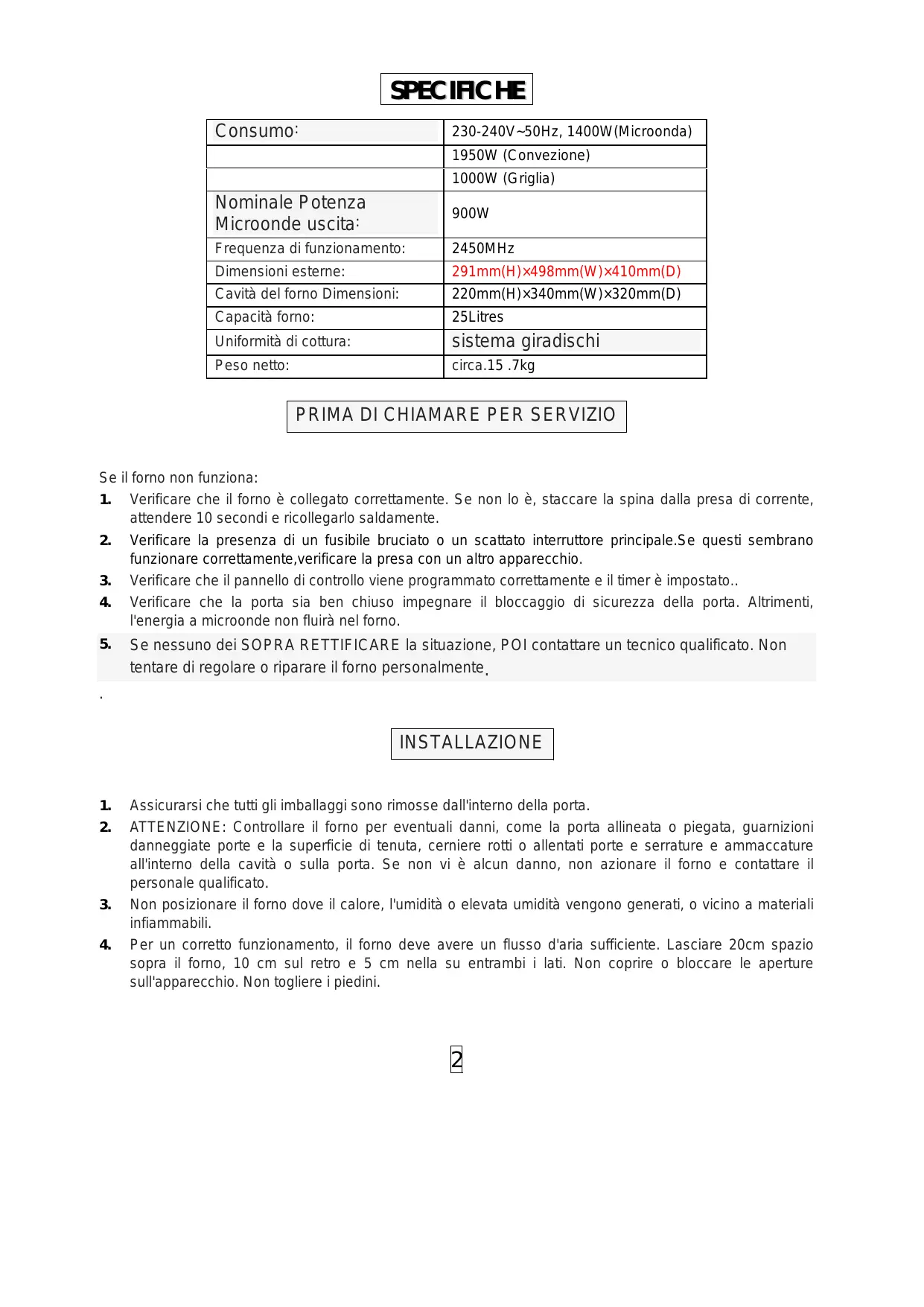 Si prega di leggere attendamente le istruzioni prima di installare eutilizzare ilorno.