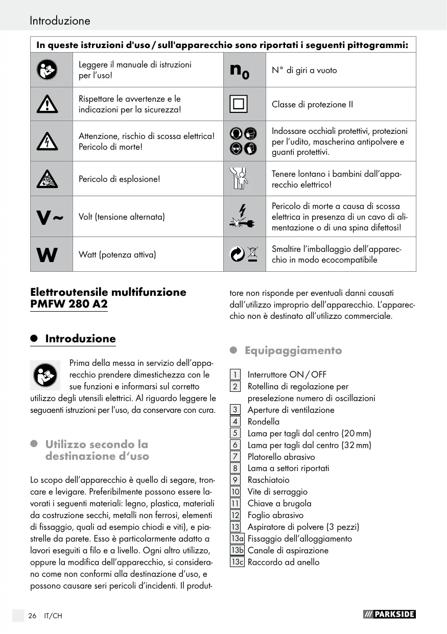 tilizzo secondo la destinazione d‘uso Lo scopo dell’apparecchio è quello di segare, troncare e levigare. Preferibilmente possono essere lavorati i seguenti materiali: legno, plastica, materiali da costruzione secchi, metalli non ferrosi, elementi di fissaggio, quali ad esempio chiodi e viti), e piastrelle da parete. Esso è particolarmente adatto a lavori eseguiti a filo e a livello. Ogni altro utilizzo, oppure la modifica dell’apparecchio, si considerano come non conformi alla destinazione d’uso, e possono causare seri pericoli d’incidenti. Il produt26 IT/CH tore non risponde per eventuali danni causati dall‘utilizzo improprio dell’apparecchio. L’apparecchio non è destinato all’utilizzo commerciale. Q Equipaggiamento 1 Interruttore ON / OFF 2 Rotellina di regolazione per