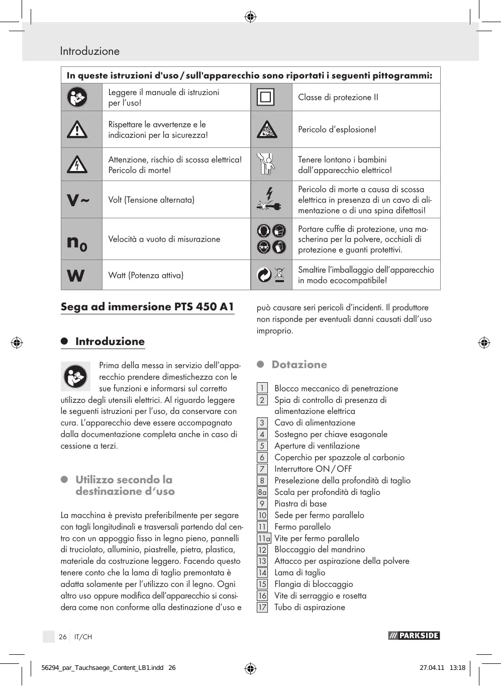 alimentazione elettrica Cavo di alimentazione Sostegno per chiave esagonale Aperture di ventilazione Coperchio per spazzole al carbonio Interruttore ON / OFF Preselezione della profondità di taglio Scala per profondità di taglio Piastra di base Sede per fermo parallelo Fermo parallelo Vite per fermo parallelo Bloccaggio del mandrino Attacco per aspirazione della polvere Lama di taglio Flangia di bloccaggio Vite di serraggio e rosetta Tubo di aspirazione IT/CH 56294_par_Tauchsaege_Content_LB1.indd 26