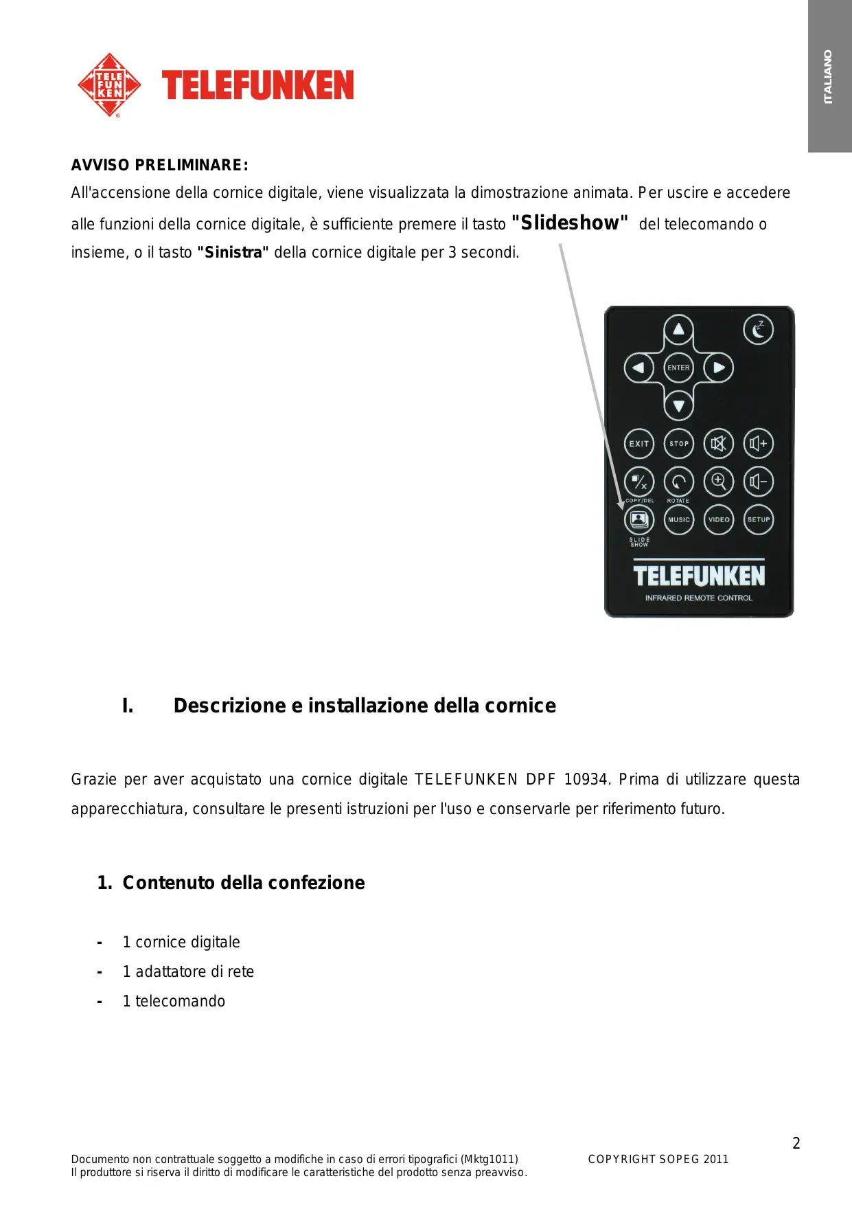 Documento non contrattuale soggetto a modifiche in caso di errori tipografici (Mktg1011) Il produttore si riserva il diritto di modificare le caratteristiche del prodotto senza preavviso. COPYRIGHT SOPEG 2011 ITALIANO AVVISO PRELIMINARE: All'accensione della cornice digitale, viene visualizzata la dimostrazione animata. Per uscire e accedere alle funzioni della cornice digitale, è sufficiente premere il tasto "Slideshow" del telecomando o insieme, o il tasto "Sinistra" della cornice digitale per 3 secondi.