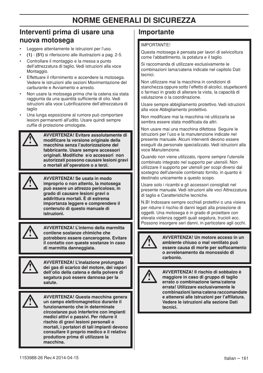 1153988-26 Rev.4 2014-04-15 AVVERTENZA! L’inalazione prolungata dei gas di scarico del motore, dei vapori dell’olio della catena e della polvere di segatura può essere dannosa per la salute.