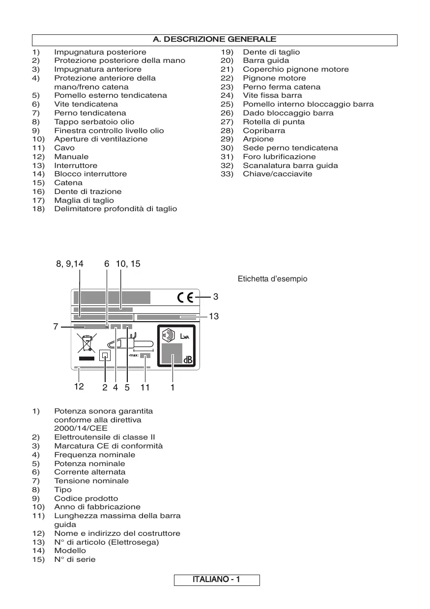 10) 11) 12) 13) 14) 15) 16) 17) 18) 19) 20) 21) 22) 23) 24) 25) 26) 27) 28) 29) 30) 31) 32) 33) Impugnatura posteriore Protezione posteriore della mano Impugnatura anteriore Protezione anteriore della mano/freno catena Pomello esterno tendicatena Vite tendicatena Perno tendicatena Tappo serbatoio olio Finestra controllo livello olio Aperture di ventilazione Cavo Manuale Interruttore Blocco interruttore Catena Dente di trazione Maglia di taglio Delimitatore profondità di taglio 8, 9,14 Dente di taglio Barra guida Coperchio pignone motore Pignone motore Perno ferma catena Vite fissa barra Pomello interno bloccaggio barra Dado bloccaggio barra Rotella di punta Copribarra Arpione Sede perno tendicatena Foro lubrificazione Scanalatura barra guida Chiave/cacciavite 6 10, 15 Etichetta d’esempio
