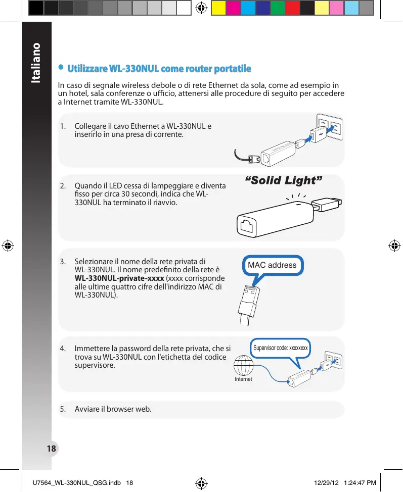 Scarica le istruzioni per il tuo Punto di accesso wireless in formato PDF gratuitamente! Trova il tuo manuale WL-330NUL - ASUS e riprendi in mano il tuo dispositivo elettronico. In questa pagina sono pubblicati tutti i documenti necessari per l'utilizzo del tuo dispositivo. WL-330NUL del marchio ASUS.