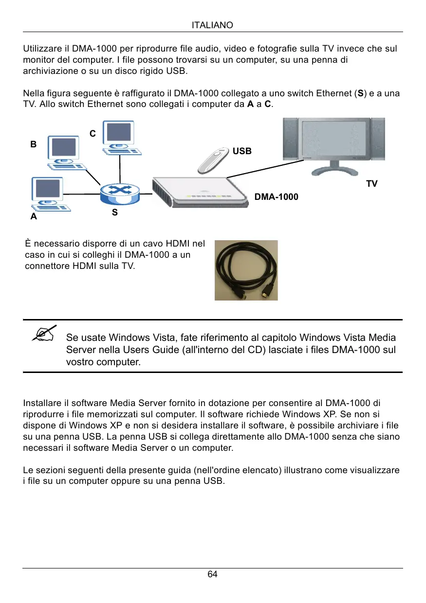 ITALIANO Utilizzare il DMA-1000 per riprodurre file audio, video e fotografie sulla TV invece che sul monitor del computer. I file possono trovarsi su un computer, su una penna di archiviazione o su un disco rigido USB. Nella figura seguente è raffigurato il DMA-1000 collegato a uno switch Ethernet (S) e a una TV. Allo switch Ethernet sono collegati i computer da A a C.