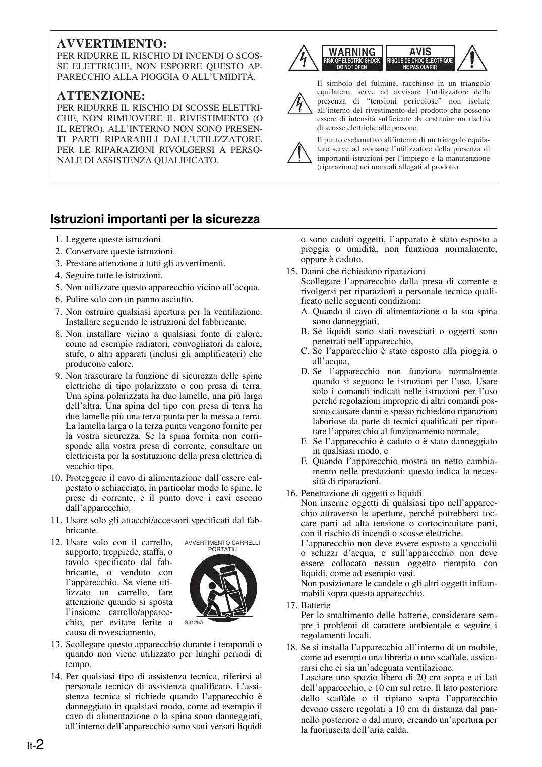 1. 2. Ne vous servez pas de cet appareil à proximité d’eau. Essuyez le boîtier avec un chiffon sec uniquement. Ne bloquez pas les orifices d’aération. Installez cet appareil en suivant les instructions du fabricant. Ne le placez pas à proximité de sources de chaleur telles que radiateurs, chauffage, poêles ou autre dispositif (y compris les amplificateurs) générateur de chaleur. N’essayez pas de circonvenir le dispositif de sécurité que représente une fiche polarisée ou une fiche avec mise à la terre. Une fiche polarisée dispose de deux lames dont l’une est plus large que l’autre. Une fiche avec terre est munie de deux lames ainsi que d’une broche de mise à la terre. La lame la plus large ou la broche assurent votre sécurité. Si la fiche fournie ne peut être insérée dans la prise murale, demandez à un électricien de remplacer la prise. Protégez le cordon d’alimentation en évitant qu’on ne marche pas dessus et qu’il ne soit plié (notamment au niveau des fiches, des cache-câbles et de la sortie de l’appareil). Servez-vous exclusivement des fixations/accessoires préconisés par le fabricant. AVERTISSEMENT POUR Utilisez exclusivement le chariot, le support, le trépied, la SUPPORTS À ROULETTES fixation ou la table spécifié(e) par le fabricant ou vendu(e) avec l’appareil. Un chariot contenant l’appareil doit toujours être déplacé avec précaution pour éviter qu’il ne se S3125A renverse et blesse quelqu’un. Débranchez l’appareil durant un orage ou lorsqu’il reste inutilisé longtemps. Veuillez faire appel à un technicien qualifié pour l’entretien. Un entretien est indispensable si l’appareil a été endommagé d’une façon ou d’une autre: cordon d’alimentation ou fiche endommagée, liquide renversé ou chute de petits objets dans l’appareil, exposition à la pluie ou à une humidité excessive, fonctionnement anormal ou chute de l’appareil.