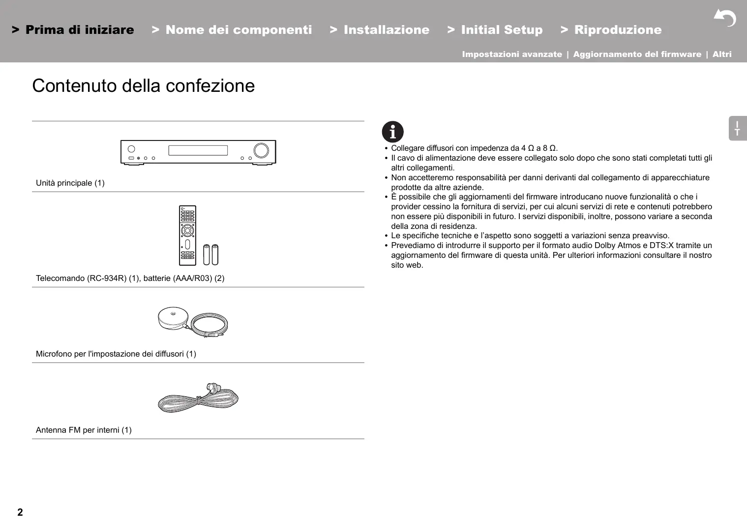 PCM linéaires 2 canaux : 32 kHz, 44,1 kHz, 48 kHz, Onkyo Corporation non garantisce la compatibilità BLUETOOTH tra il ricevitore AV e tutti i dispositivi abilitati al BLUETOOTH. Per verificare la compatibilità tra il ricevitore AV e un altro dispositivo dotato di tecnologia BLUETOOTH, consultare la documentazione del dispositivo in questione o contattare il rivenditore. In alcuni Paesi potrebbero esistere delle limitazioni per l'utilizzo di dispositivi BLUETOOTH. Verificare le condizioni con le autorità locali. Qué se encuentra en la caja 2 Nombres de las piezas Panel frontal 3 Panel trasero 4 Mando a distancia 5 Resolución de problemas 65 Especificaciones generales 70 Acerca de HDMI 72 Información sobre licencias y marcas comerciales 73