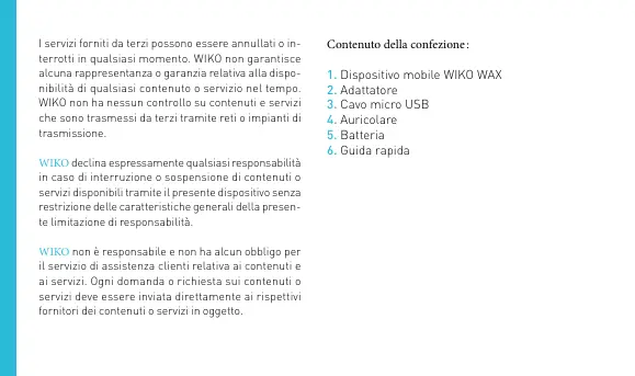SIONI E LIMITAZIONI NON SIANO APPLICABILI. I servizi forniti da terzi possono essere annullati o interrotti in qualsiasi momento. WIKO non garantisce alcuna rappresentanza o garanzia relativa alla disponibilità di qualsiasi contenuto o servizio nel tempo. WIKO non ha nessun controllo su contenuti e servizi che sono trasmessi da terzi tramite reti o impianti di trasmissione. WIKO declina espressamente qualsiasi responsabilità in caso di interruzione o sospensione di contenuti o servizi disponibili tramite il presente dispositivo senza restrizione delle caratteristiche generali della presente limitazione di responsabilità. WIKO non è responsabile e non ha alcun obbligo per il servizio di assistenza clienti relativa ai contenuti e ai servizi. Ogni domanda o richiesta sui contenuti o servizi deve essere inviata direttamente ai rispettivi fornitori dei contenuti o servizi in oggetto. Contenuto della confezione :