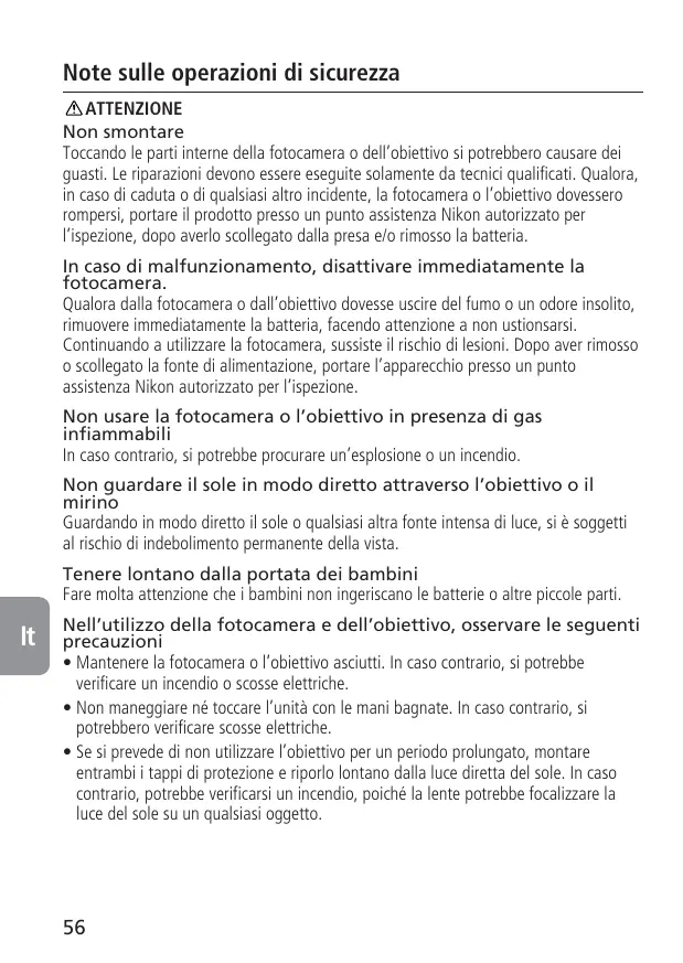 En cas de dysfonctionnement, éteignez immédiatement Si vous remarquez de la fumée ou une odeur inhabituelle se dégageant de l’appareil photo ou de l’objectif, retirez immédiatement l’accumulateur ou les piles, en prenant soin de ne pas vous brûler. Continuer d’utiliser son matériel peut entraîner des blessures. Après avoir retiré ou débranché la source d’alimentation, confiez votre matériel à un centre de service agréé Nikon pour le faire vérifier. N’utilisez pas l’appareil photo ou l’objectif en présence de gaz inflammable N’utilisez pas de matériel électronique en présence de gaz inflammable car cela risque de provoquer une explosion ou un incendie. Ne regardez pas le soleil dans l’objectif ou le viseur Regarder le soleil ou tout autre source lumineuse violente dans l’objectif ou le viseur peut provoquer de graves lésions oculaires irréversibles. Tenez hors de portée des enfants Faites extrêmement attention à ce que les enfants ne mettent pas à la bouche les accumulateurs/piles ou d’autres petites pièces. Observez les précautions suivantes lorsque vous manipulez l’appareil et l’objectif • Maintenez l’appareil et l’objectif au sec. Le non-respect de cette précaution peut provoquer un incendie ou une électrocution. • Ne manipulez pas et ne touchez pas le matériel avec les mains humides. Le nonrespect de cette précaution peut provoquer une électrocution. • Lorsque vous n’utilisez pas l’objectif pendant une longue période, fixez les bouchons avant et arrière et rangez l’objectif à l’abri de la lumière directe du soleil. Le nonrespect de cette précaution peut provoquer un incendie, car l’objectif peut concentrer la lumière du soleil sur un objet.