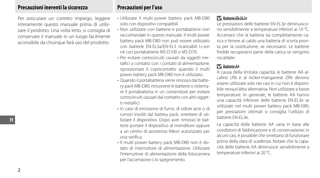 A causa della limitata capacité, le batterie AA alcaline LR6 e al nickel-manganese ZR6 devono essere utilizzate solo nei casi in cui non è disponibile nessun'altra alternativa. Non utilizzato aasse temperature. In generale, le batterie AA hanno una capacité inferiore delle batterie EN-EL3e seutilizzate nel multi power battery pack MB-D80; per prestazioni ottimali si consiglia l'utilizzo di batterie EN-EL3e.