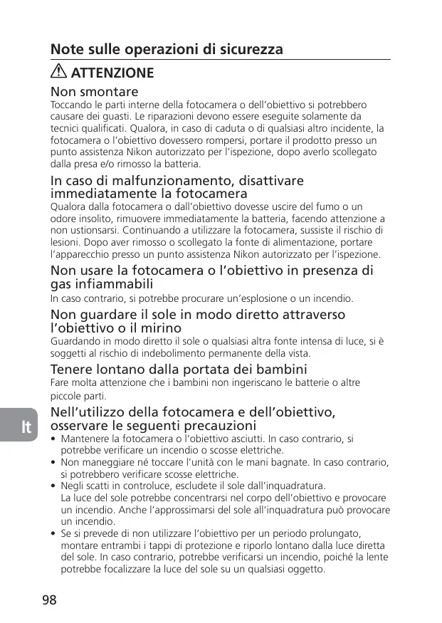 Si vous remarquez de la fumée ou une odeur inhabituelle se dégageant de l’appareil photo ou de l’objectif, retirez immédiatement l’accumulateur ou les piles, en prenant soin de ne pas vous brûler. Continuer d’utiliser son matériel peut entraîner des blessures. Après avoir retiré ou débranché la source d’alimentation, confiez votre matériel à un centre de service agréé Nikon pour le faire vérifier.