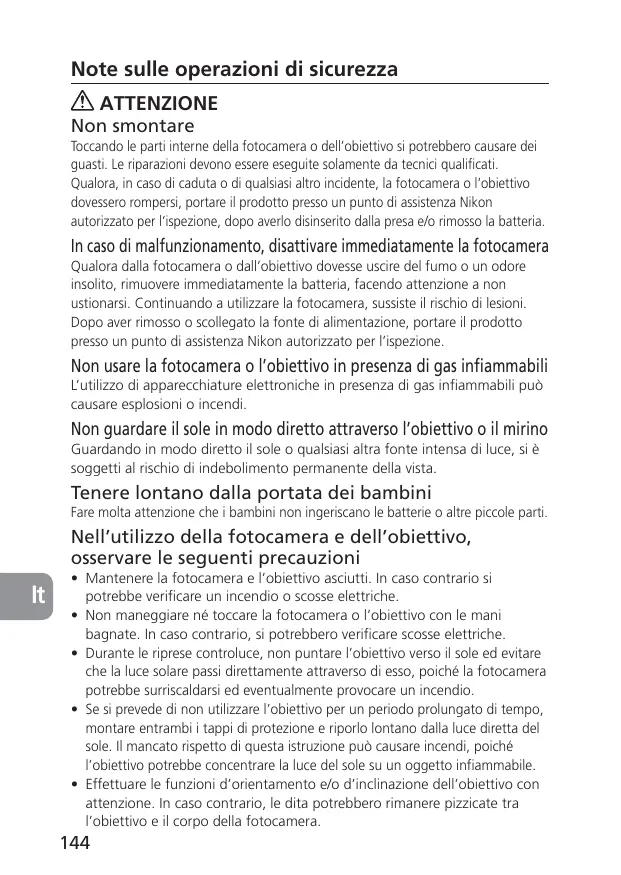 Note sulle operazioni di sicurezza ATTENZIONE Non smontare Toccando le parti interne della fotocamera o dell’obiettivo si potrebbero causare dei guasti. Le riparazioni devono essere eseguite solamente da tecnici qualificati. Qualora, in caso di caduta o di qualsiasi altro incidente, la fotocamera o l’obiettivo dovessero rompersi, portare il prodotto presso un punto di assistenza Nikon autorizzato per l’ispezione, dopo averlo disinserito dalla presa e/o rimosso la batteria.