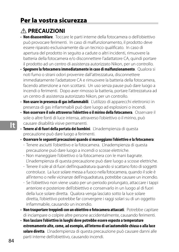 • Non disassemblare. Toccare le parti interne della fotocamera o dell’obiettivo può provocare ferimenti. In caso di malfunzionamento, il prodotto deve essere riparato esclusivamente da un tecnico qualificato. In caso di apertura del prodotto in seguito a cadute o altri incidenti, rimuovere la batteria della fotocamera e/o disconnettere l’adattatore CA, quindi portare il prodotto ad un centro di assistenza autorizzato Nikon, per un controllo. • Spegnere la fotocamera immediatamente in caso di malfunzionamento. Qualora si noti fumo o strani odori provenire dall’attrezzatura, disconnettere immediatamente l’adattatore CA e rimuovere la batteria della fotocamera, facendo attenzione a non scottarsi. Un uso senza pause può dare luogo a incendi o ferimenti. Dopo aver rimosso la batteria, portare l’attrezzatura ad un centro di assistenza autorizzato Nikon, per un controllo. • Non usare in presenza di gas infiammabili. L’utilizzo di apparecchi elettronici in presenza di gas infiammabili può dare luogo ad esplosioni o incendi. • Non osservare il sole attraverso l’obiettivo o il mirino della fotocamera. Osservare il sole o altre fonti di luce intensa, attraverso l’obiettivo o il mirino, può causare disabilità visive permanenti. • Tenere al di fuori della portata dei bambini. L’inadempienza di questa precauzione può dare luogo a ferimenti. • Osservare le seguenti precauzioni quando si maneggiano l’obiettivo e la fotocamera: - Tenere asciutti l’obiettivo e la fotocamera. L’inadempienza di questa precauzione può dare luogo a incendi o scosse elettriche. - Non maneggiare l’obiettivo o la fotocamera con le mani bagnate. L’inadempienza di questa precauzione può dare luogo a scosse elettriche. - Tenere il sole al di fuori dell’inquadratura quando si scattano foto di soggetti controluce. La luce solare messa a fuoco nella fotocamera, quando il sole è all’interno o nelle vicinanze dell’inquadratura, potrebbe causare un incendio. - Se l’obiettivo non viene usato per un periodo prolungato, attaccare i tappi anteriore e posteriore dell’obiettivo e conservarlo in un luogo al di fuori della luce solare diretta. Qualora venga lasciato sotto la luce solare diretta, l’obiettivo potrebbe far convergere i raggi solari su di un oggetto infiammabile, causando un incendio. • Non trasportare treppiedi con un obiettivo o fotocamera attaccati. Potrebbe capitare di inciampare o colpire altre persone accidentalmente, causando ferimenti. • Non lasciare l’obiettivo in luoghi dove potrebbe essere esposto a temperature estremamente alte, come, ad esempio, all’interno di un’automobile chiusa o alla luce solare diretta. L’inadempienza di questa precauzione può causare danni alle parti interne dell’obiettivo, causando incendi.