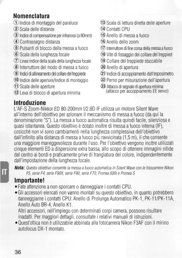 F5, serie F4, serie F90X, serie F90, serie F70, Pronea BOOi e Pronea S Importante! • Fate attenzione a non sporcare o danneggiare i contatti CPU. • G l i accessori elencati non vanno montati su questo obiettivo, in quanto potrebbero danneggiarne i contatti CPU: Anello di Prolunga Automatico PK-1, PK-11/PK-11A, Anello Auto BR-4, Anello K1. Altri accessori, nell'impiego con determinati corpi camera, possono risultare inadatti. Per maggiori dettagli, consultate i relativi manuali di istruzioni. •Quest'ottica non e utilizzabile abbinata alia fotocamera Nikon F3AF con il mirino autofocus DX-1 montato.