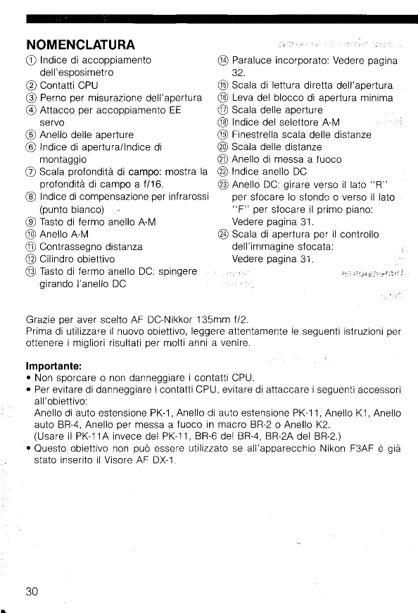 Avant d'utiliser votre nouvel objectif, veuillez lire attentivement les instructions qui suivent pour tirer le meilleur parti de votre objectif tout de suite et pendant de longues annees. Important! • Veiller a ne pas salir ou endommager les contacts CPU. • Ne pas fixer les aecessoires suivants a un objectif, car ils peuvent endommager les contacts CPU de I'objectif: Bague d'auto-rallonge PK-1, Bague d'auto-rallonge PK-11, Bague K1, Auto Bague BR-4, Bague d'adaptateur Macro BR-2 ou Bague K2. (Utiliser la PK-11A a la place de PK-11, BR-6 a la place de BR-4 et BR-2A a la place de BR-2.) • Cet objectif ne peut pas s'employer a I'intention du Viseur AF de DX-1 fixe a I'appareil F3AF Nikon.