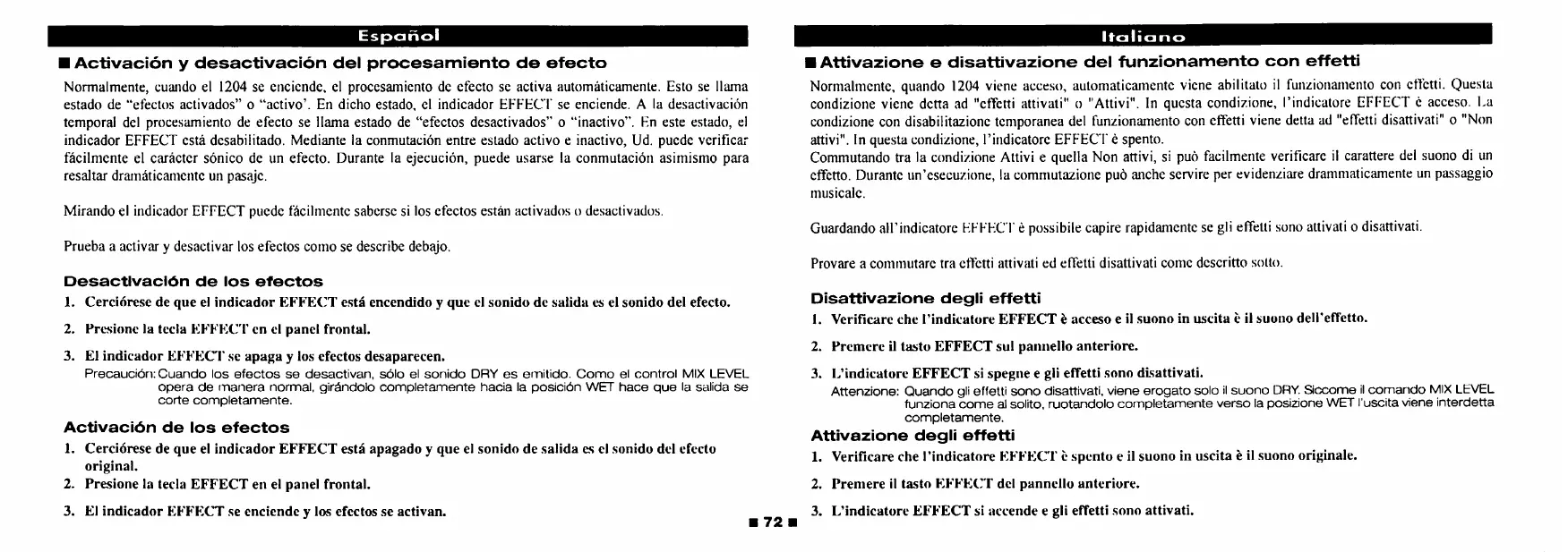 Attenzione: I comandi LOW e HlGH EQ del pannello anteriore hanno influenza solo sul suono WET (effetto), non sul suono DRY (originale).Se il suono in uscita sembra distort0 sebbene I'indicatorePEAK non si accenda frequentemente,un comando EQ potrebbe essere impostato su una posizionecausa d~un eccessivo incrernento. Se necessario, provare a regolare quel comando. Activacion y desactivacion del procesamiento de efecto Normalmente, cuando el 1204 se encicnde. el procesamiento dc efecto se activa autorniiticarnente. Esto se llama estado de "efectos activados" o "activo'. En dicho estado, cl indicador EFFECI' se enciende. A la desactivacion temporal del procesamiento de efecto se llama estado de "efectos desactivados" o "inactivo". En este estado, el indicador EFFECT csta dcsabilitado. Mediante la conmutacion entre estado activo e inactivo, Ud. pucdc vcrificx facilmente el caractcr sonico de un efecto. Durante la ejecucion, puede usarse la conmutaci6n asirnisrno para resaltar drarnQticanmtc un pasajc. Attivazione e disattivazione del funzionarnento con effetti Normalmcntc, quando 1204 viene acceso, automatic~ncntcvicne abilitato i l funzionarnento con ctfctti. Questa condizione vicnc dctta ad "ct'fctti attivati" o "Attivi". In qucsta condizione, I'indicatore EFFECT c acceso. La condizione con disabilitazionc teniporanea del funzionan~entocon cffetti viene detta ad "effetti disattivati" o "Non attivi". In questa condizione, I'indicatorc EFFECT e spento. Commutando tra la condizione Attivi e quella Non attivi, si pub facilmente verificarc il carattere del suono di un effctto. Durantc un'csecuzione, la commutazione pub anche servire per rvidenziare dranmaticamente un passaggio musicalc. Mirando el indicador EFFECT puedc fhcilmcntc sabcrsc si 10s efectos e s t b activados o desactivados. Guardando all'indicatore EFFEC'I' C possibile capire rapidanlcntc se gli effetti sono altivati o disattivati. Prueba a activar y desactivar los efectos corno se describe debajo. Provare a conmutarc tra effctti attivati ed effetti disattivati comc dcscritto sotto. Desactlvacldn de 10s efectos