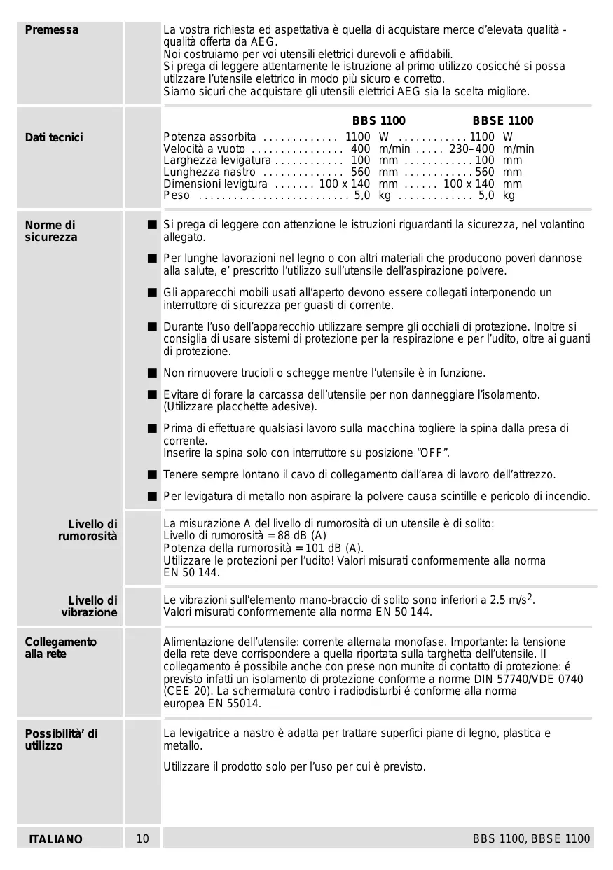 Le vibrazioni sull'elemento mano-braccio di solito sono inferiori a 2.5 m/s2. Valori misurati conformemente alla norma EN 50 144. Alimentazione dell utensile: corrente altemata monofase. Important: la tensione della rete deve corrispondere à quella riportata sulla targheti dellutensile. I collegamento é possibile anche con prese non munite di contatto di protezione: é previsto infatti un isolamento di protezione conforme a norme DIN 57740/VDE 0740 (CEE 20). La schermatura contro i radiodisturbi é conforme alla nomma europea EN 55014. La levigatrice a nastro è adatta per trattare superfci piane di legno, plastica e metal. Utlizzare il prodotto solo per l'uso per cui à previsto. BBS 1100, BBSE 1100