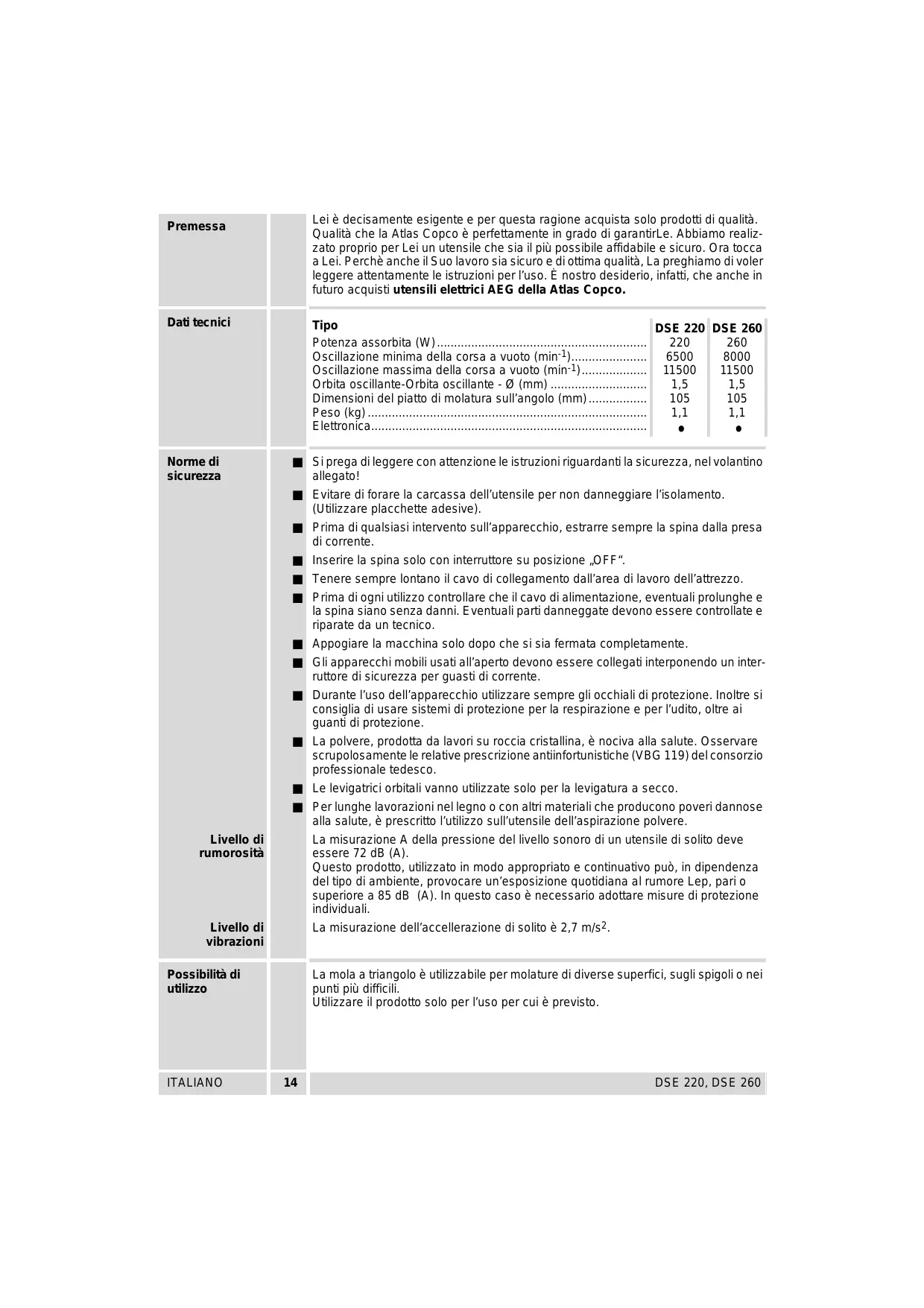 Premessa Dati tecnici Norme di Sicurezza Livello di rumorosità Livello di vibrazioni Possibilità di utilizzo ITALIANO Lei à decisamente esigente e per questa ragione acquista solo prodotti di qualità. Qualità che la Atlas Copco à perfettamente in grado di garantirLe. Abbiamo realiz- zato proprio per Lei un utensile che sia il più possibile affidabile e sicuro. Ora tocca à Lei. Perchè anche il Suo lavoro sia sicuro e di ottima qualità, La preghiamo di voler leggere attentamente le istuzioni per l'uso. Ë nostro desiderio, infatti, che anche in lettrici AEG della Atlas Copco. futuro acquisti utens: Tipo DSE 220 DSE 260 Potenza assorbita (W)... 220 260 Oscillazione minima della corsa à vuoto (min) 6500 | 8000 Oscillazione massima della corsa a vuoto (min-1) 11500 11500 Orbita oscillante-Orbita oscillante - 2 (mm) … 1,5 1,5 Dimensioni del piatto di molatura sull'angolo (mm). 105 105 Peso (kg) 11 11 Elettronica . . Siprega di leggere con attenzione le istruzioni riguardanti la sicurezza, nel volantino allegato! Evitare di forare la carcassa dell'utensile per non danneggiare l'isolamento (Utilizzare placchette adesive). Prima di qualsiasi intervento sull'apparecchio, estrarre sempre la spina dalla presa di corrente. Inserire la spina solo con interruttore su posizione ,OFF“. Tenere sempre lontano il cavo di collegamento dall'area di lavoro dell'attrezzo. Prima di ogni utilizzo controllare che il cavo di alimentazione, eventuali prolunghe e la spina siano senza danni. E ventuali parti danneggate devono essere controllate e riparate da un tecnico Appogiare la macchina solo dopo che si sia fermata completamente. Gli apparecchi mobil usati all'aperto devono essere collegati interponendo un inter- ruttore di sicurezza per guast di corrente. Durant l'uso dell'apparecchio utlizzare sempre gli occhiali di protezione. Inoltre si consiglia di usare sistemi di protezione per la respirazione e per l'udito, oltre ai guanti di protezione. La polvere, prodotta da lavori su roccia cristallina, à nociva alla salute. Osservare scrupolosamente le relative prescrizione antinfortunistiche (VBG 119) del consorzio professionale tedesco. Le levigatrici orbitali vanno utilizzate solo per la levigatura a secco. Per lunghe lavorazioni nel legno o con altri materiali che producono poveri dannose alla salute, à prescritto l'utilizzo sullutensile dell’aspirazione polvere. La misurazione A della pressione del livello sonoro di un utensile di solito deve essere 72 dB (A) Questo prodotto, utilizzato in modo appropriato e continuativo pub, in dipendenza del tipo di ambiente, provocare un'esposizione quotidiana al rumore Lep, pari o superiore a 85 dB (A). In questo caso è necessario adottare misure di protezione individuali. La misurazione dell'accellerazione di solito à 2,7 m/s2. La mola a triangolo à utilizzabile per molature di diverse superfci, sugli spigoli o nei punti più dificil. Utiizzare il prodotto solo per l'uso per cui à previsto. DSE 220, DSE 260