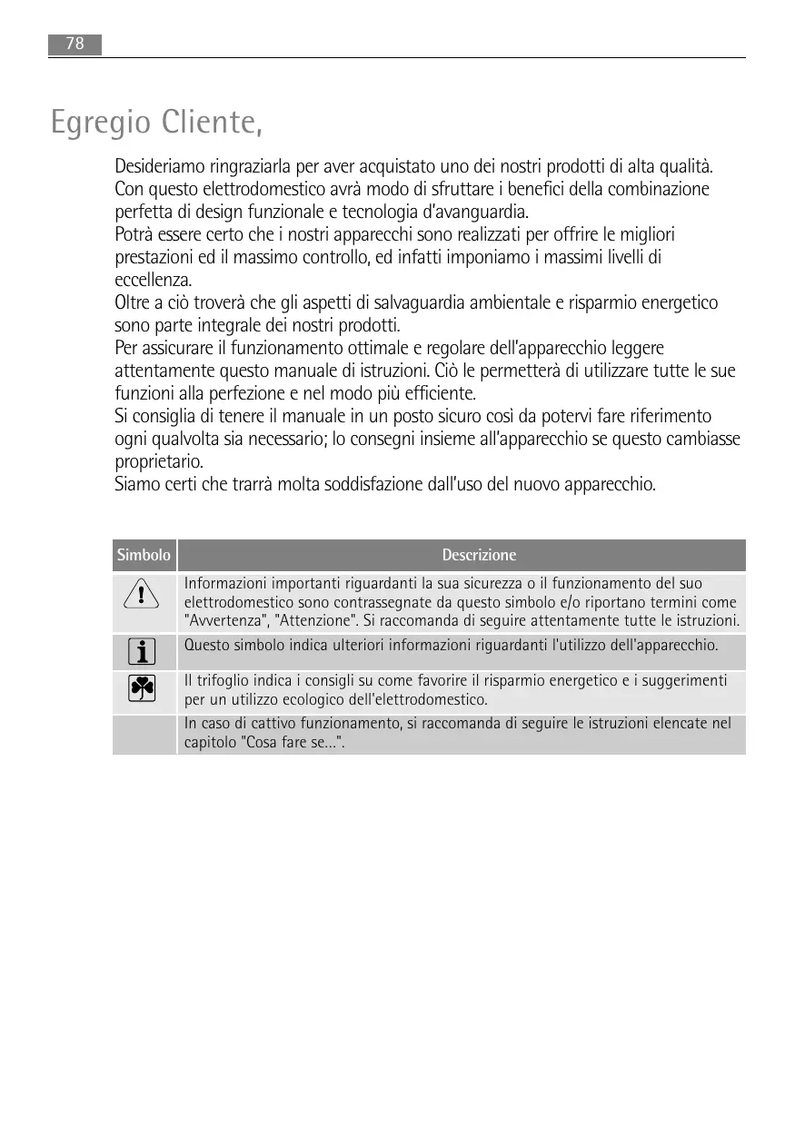 Egregio Cliente, Desideriamo ringraziarla per aver acquistato uno dei nostri prodotti di alta qualità. Con questo elettrodomestico avrà modo di sfruttare i benefici della combinazione perfetta di design funzionale e tecnologia d’avanguardia. Potrà essere certo che i nostri apparecchi sono realizzati per offrire le migliori prestazioni ed il massimo controllo, ed infatti imponiamo i massimi livelli di eccellenza. Oltre a ciò troverà che gli aspetti di salvaguardia ambientale e risparmio energetico sono parte integrale dei nostri prodotti. Per assicurare il funzionamento ottimale e regolare dell’apparecchio leggere attentamente questo manuale di istruzioni. Ciò le permetterà di utilizzare tutte le sue funzioni alla perfezione e nel modo più efficiente. Si consiglia di tenere il manuale in un posto sicuro così da potervi fare riferimento ogni qualvolta sia necessario; lo consegni insieme all’apparecchio se questo cambiasse proprietario. Siamo certi che trarrà molta soddisfazione dall’uso del nuovo apparecchio. Simbolo Descrizione Informazioni importanti riguardanti la sua sicurezza o il funzionamento del suo elettrodomestico sono contrassegnate da questo simbolo e/o riportano termini come "Avvertenza", "Attenzione". Si raccomanda di seguire attentamente tutte le istruzioni. Questo simbolo indica ulteriori informazioni riguardanti l'utilizzo dell'apparecchio. Il trifoglio indica i consigli su come favorire il risparmio energetico e i suggerimenti per un utilizzo ecologico dell'elettrodomestico. In caso di cattivo funzionamento, si raccomanda di seguire le istruzioni elencate nel capitolo "Cosa fare se…". Indice