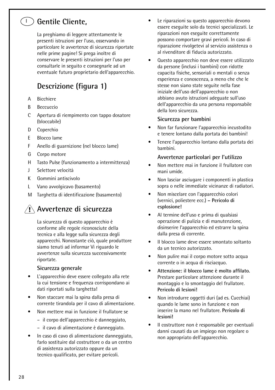 - Non introdurre oggetti duri (ad es. Cucchiai) quando le lame sono in funzione e non insertire la mano nel frullatore. Pericolo di lesions!
