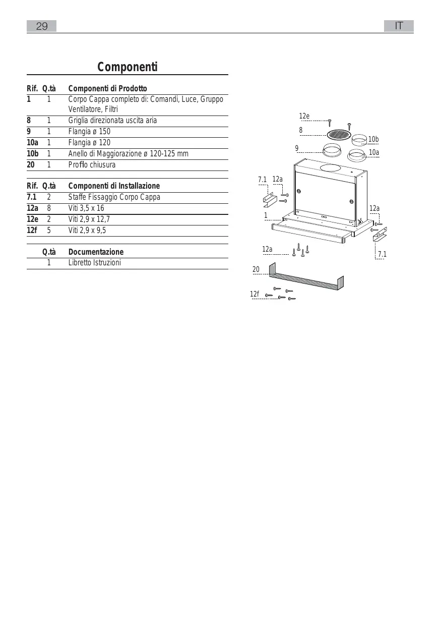 Componenti di Prodotto Corpo Cappa completo di: Comandi, Luce, Gruppo Ventilatore, Filtri Griglia direzionata uscita aria Flangia ø 150 Flangia ø 120 Anello di Maggiorazione ø 120-125 mm Profilo chiusura Componenti di Installazione Staffe Fissaggio Corpo Cappa Viti 3,5 x 16 Viti 2,9 x 12,7 Viti 2,9 x 9,5 Documentazione Libretto Istruzioni 12e