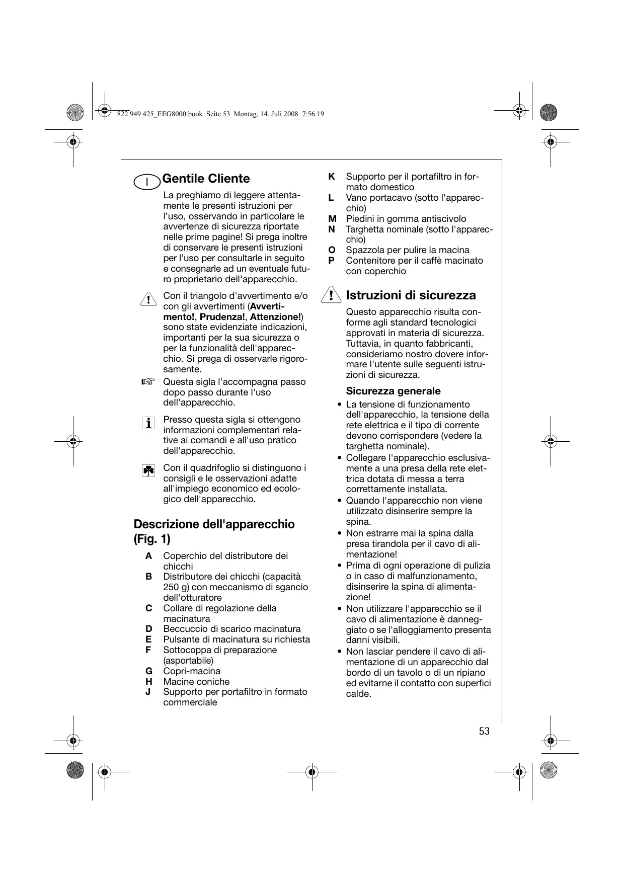 i E possibile nascondere il cavo di alimentazione non necessario nell'apposto vano (Fig. 1/L) sul fondo dell'apparecchio.