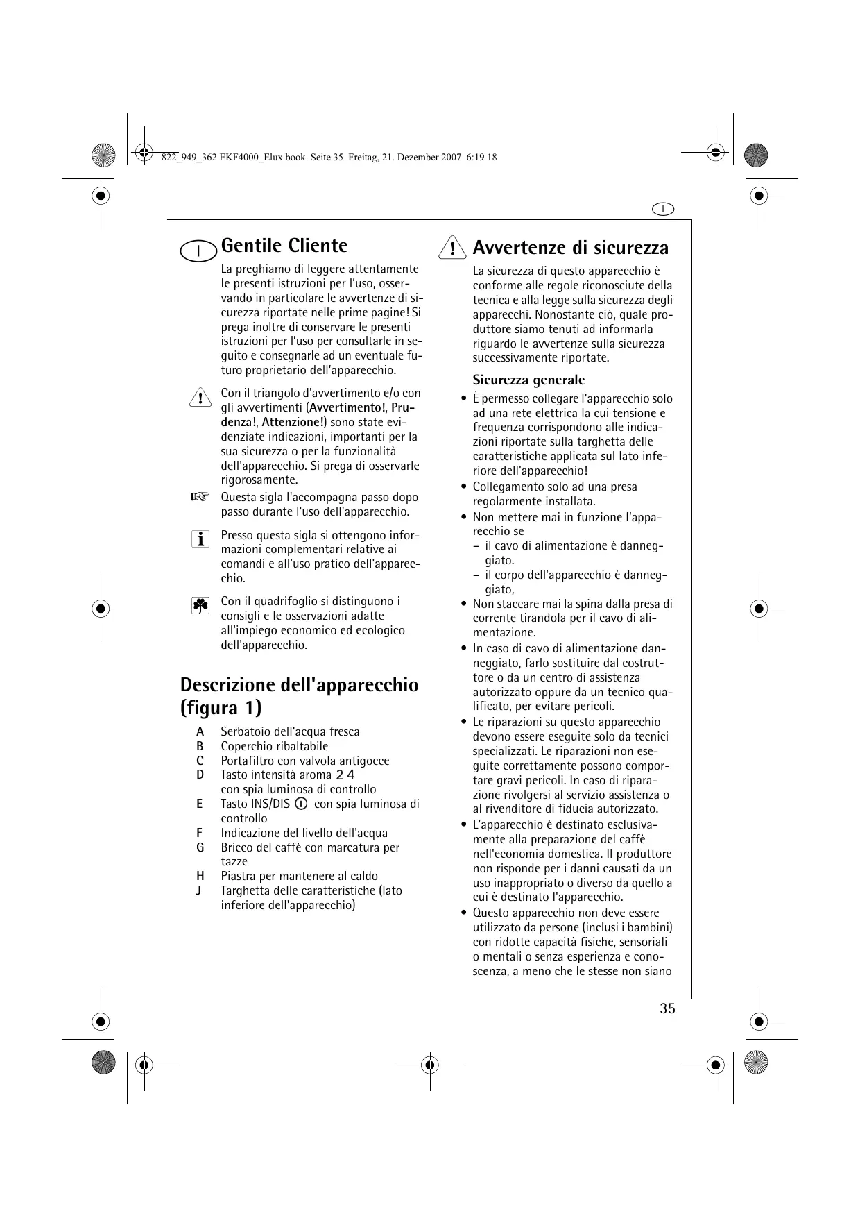 ! Durante la preparazione del caffe, non togliere il bracco per essere 30 secondi, altrimenti il liquido trabocca dal filtr. Dopo molto il bracco, la valvola del filtro impedisce lo sgociolamento sulla piastra per mantenere al caldo. La piastra per mantenere al caldo mantiene il caffe sempre alla giusta temperature. Essa resta in funzione fino a quando si spegne l'apparecchio con il tasto INS/DIS (Figura 1/E) e la spia luminosa di controllo si spegne.