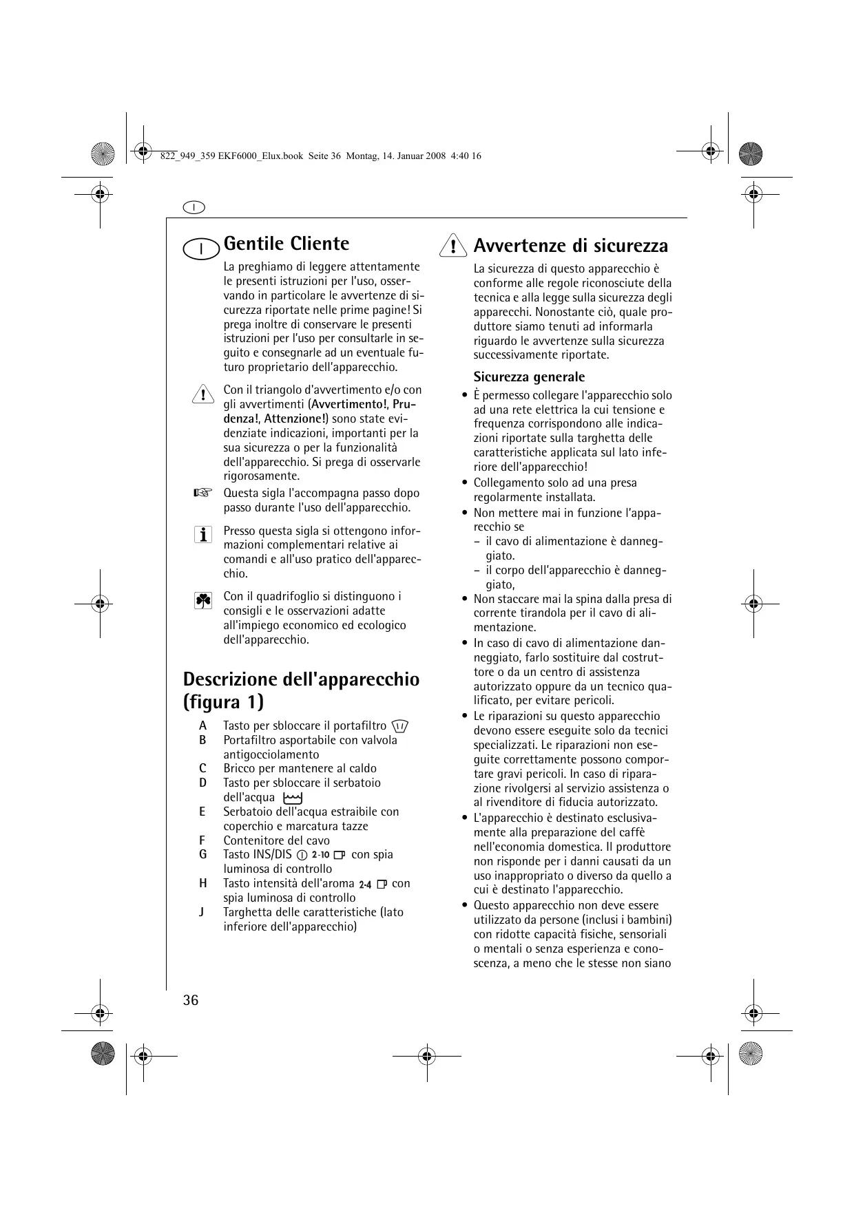 Tasto per sbloccare il portafiltro Portafiltro asportabile con valvola antigocciolamento Bricco per mantenere al caldo Tasto per sbloccare il serbatoio dell'acqua Serbatoio dell'acqua estraibile con coperchio e marcatura tazze Contenitore del cavo Tasto INS/DIS con spia luminosa di controllo Tasto intensità dell'aroma con spia luminosa di controllo Targhetta delle caratteristiche (lato inferiore dell'apparecchio) Sicurezza generale 822_949_359 EKF6000_Elux.book Seite 37 Montag, 14. Januar 2008 4:40 16