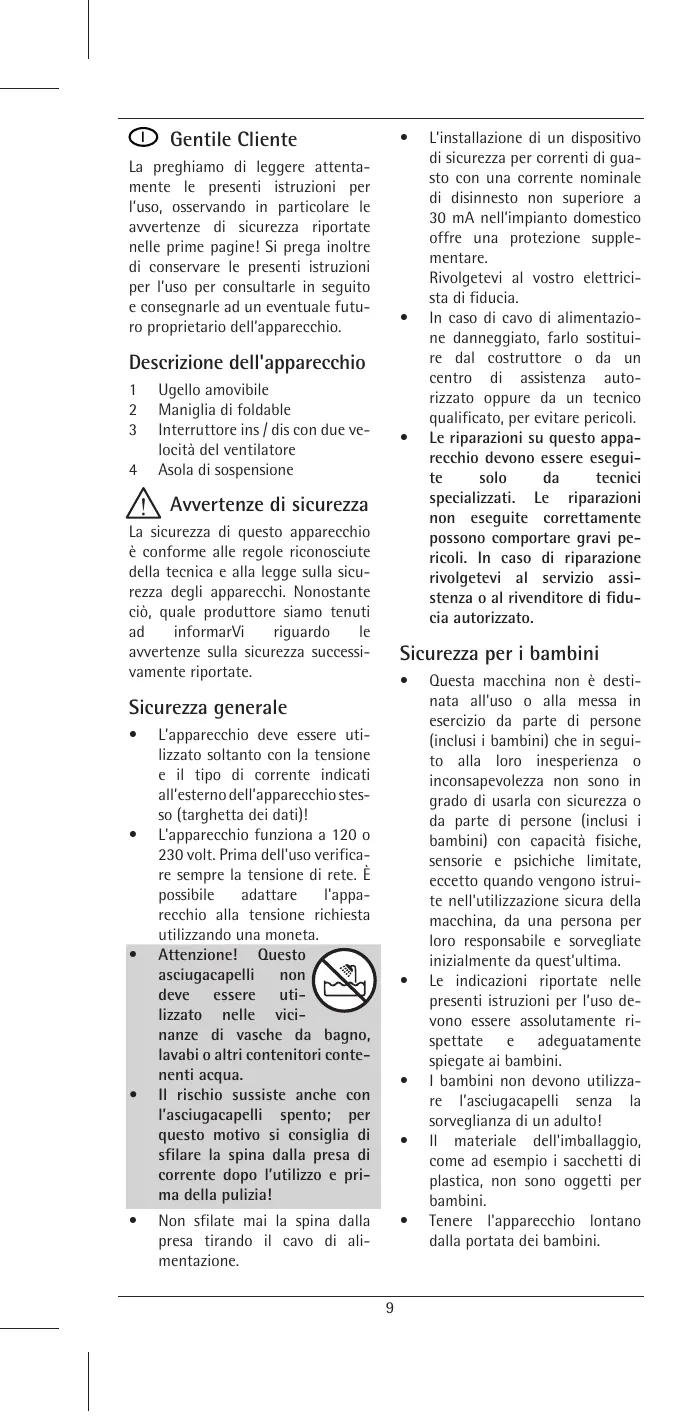 - Atte nzione ! Que sto asciugacape l i non de ve e sse re util izzato ne l e vicinanze di vasch e da bagno, avabi o al tri conte nitori conte ne nti acq ua.