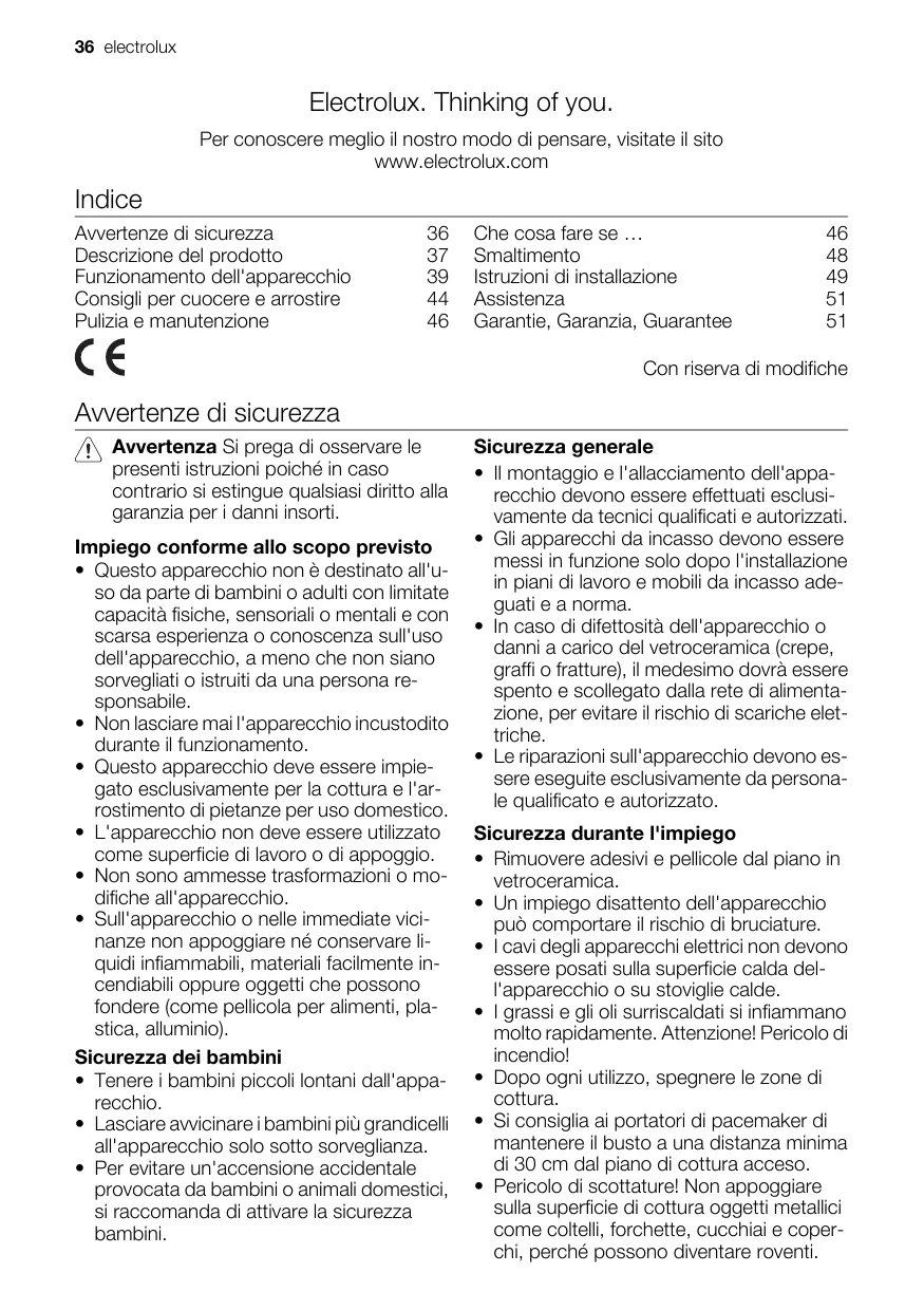 min. 25mm min. 5mm min. 20mm min. 38mm min. 5mm electrolux 51 TSB Targhetta del modello Modell GK69TSICN Prod. Nr. – 949 593 084 Typ 55GDD D4 AU 230 V, 50 Hz Electrolux Assistenza In caso di guasti tecnici si consiglia di cercare di risolvere direttamente il problema con l'ausilio delle Istruzioni per l'uso (capitolo "Che cosa fare se..."). Qualora non fosse possibile risolvere il problema, si consiglia di rivolgersi all'assistenza clienti o ad uno dei nostri associati. Per fornirvi un rapido aiuto, vi richiediamo le informazioni seguenti: – Combinazione alfanumerica a tre cifre per vetroceramica – Modello – Numero prodotto (PNC) – Numero di serie (Numero S - vedere la targhetta identificativa) – Tipo di problema – Eventuali messaggi di errore visualizzati dall'apparecchio CH Garantie, Garanzia, Guarantee Kundendienst, service-clientèle, Servizio clienti, Customer Service Centres