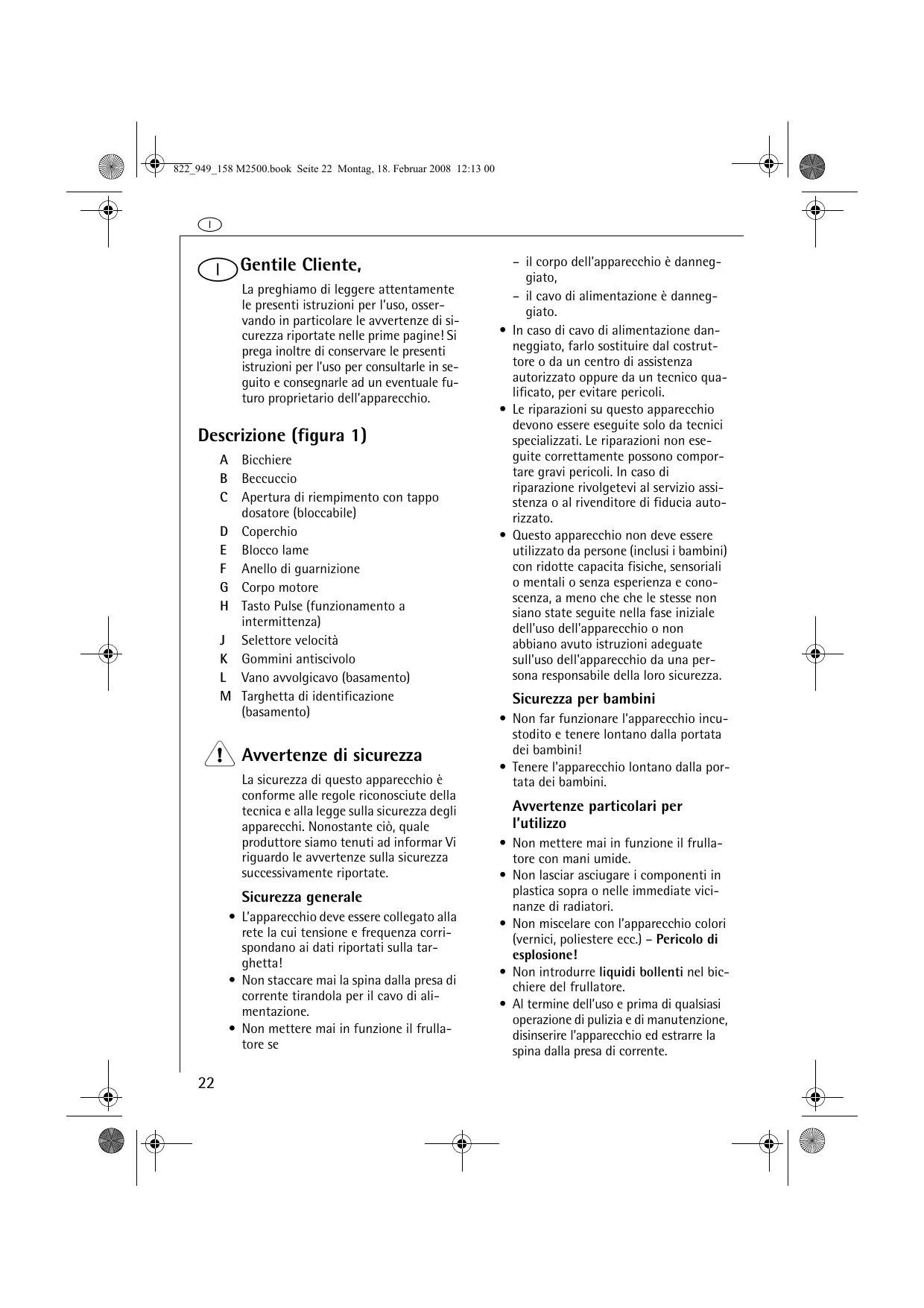 iGentile Cliente, La preghiamo di leggere attentamente le presenti istruzioni per l’uso, osservando in particolare le avvertenze di sicurezza riportate nelle prime pagine! Si prega inoltre di conservare le presenti istruzioni per l’uso per consultarle in seguito e consegnarle ad un eventuale futuro proprietario dell’apparecchio. Descrizione (figura 1) A Bicchiere B Beccuccio C Apertura di riempimento con tappo dosatore (bloccabile) D Coperchio E Blocco lame F Anello di guarnizione G Corpo motore H Tasto Pulse (funzionamento a intermittenza) J Selettore velocità K Gommini antiscivolo L Vano avvolgicavo (basamento) M Targhetta di identificazione (basamento) 1 Avvertenze di sicurezza La sicurezza di questo apparecchio è conforme alle regole riconosciute della tecnica e alla legge sulla sicurezza degli apparecchi. Nonostante ciò, quale produttore siamo tenuti ad informar Vi riguardo le avvertenze sulla sicurezza successivamente riportate. Sicurezza generale