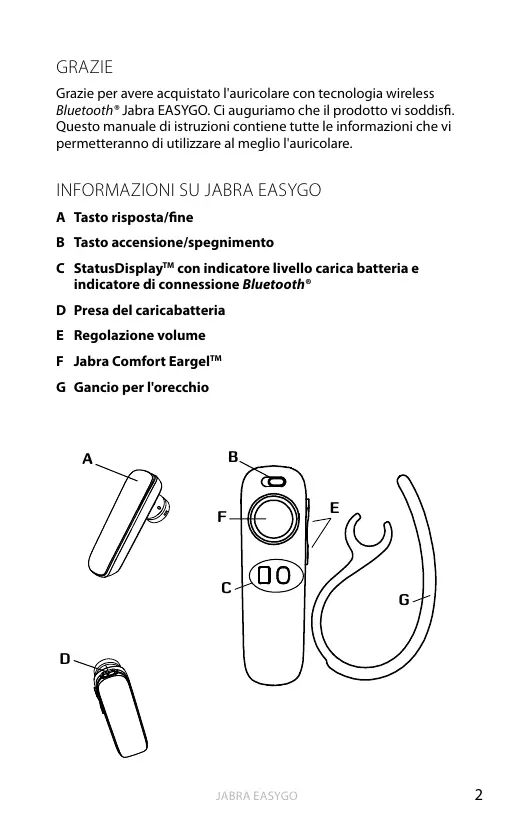 Scarica le istruzioni per il tuo Cuffie Bluetooth in formato PDF gratuitamente! Trova il tuo manuale EASYGO - JABRA e riprendi in mano il tuo dispositivo elettronico. In questa pagina sono pubblicati tutti i documenti necessari per l'utilizzo del tuo dispositivo. EASYGO del marchio JABRA.