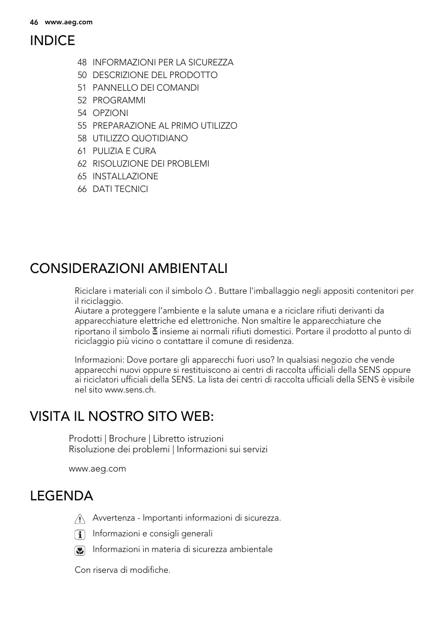 INSTALLAZIONE DATI TECNICI CONSIDERAZIONI AMBIENTALI Riciclare i materiali con il simbolo . Buttare l'imballaggio negli appositi contenitori per il riciclaggio. Aiutare a proteggere l’ambiente e la salute umana e a riciclare rifiuti derivanti da apparecchiature elettriche ed elettroniche. Non smaltire le apparecchiature che riportano il simbolo insieme ai normali rifiuti domestici. Portare il prodotto al punto di riciclaggio più vicino o contattare il comune di residenza. Informazioni: Dove portare gli apparecchi fuori uso? In qualsiasi negozio che vende apparecchi nuovi oppure si restituiscono ai centri di raccolta ufficiali della SENS oppure ai riciclatori ufficiali della SENS. La lista dei centri di raccolta ufficiali della SENS è visibile nel sito www.sens.ch. VISITA IL NOSTRO SITO WEB: Prodotti | Brochure | Libretto istruzioni Risoluzione dei problemi | Informazioni sui servizi www.aeg.com LEGENDA Avvertenza - Importanti informazioni di sicurezza. Informazioni e consigli generali Informazioni in materia di sicurezza ambientale Con riserva di modifiche. ITALIANO