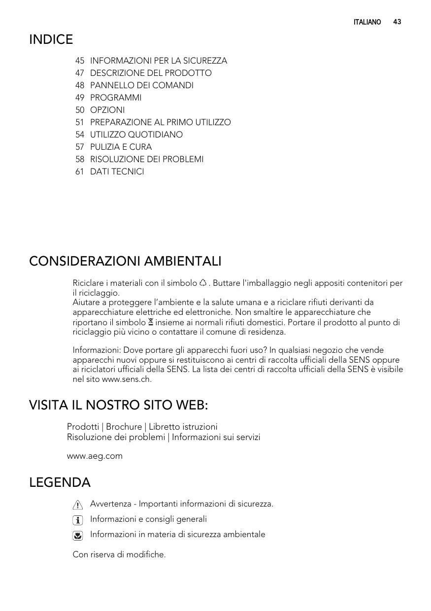 DATI TECNICI CONSIDERAZIONI AMBIENTALI Riciclare i materiali con il simbolo . Buttare l'imballaggio negli appositi contenitori per il riciclaggio. Aiutare a proteggere l’ambiente e la salute umana e a riciclare rifiuti derivanti da apparecchiature elettriche ed elettroniche. Non smaltire le apparecchiature che riportano il simbolo insieme ai normali rifiuti domestici. Portare il prodotto al punto di riciclaggio più vicino o contattare il comune di residenza. Informazioni: Dove portare gli apparecchi fuori uso? In qualsiasi negozio che vende apparecchi nuovi oppure si restituiscono ai centri di raccolta ufficiali della SENS oppure ai riciclatori ufficiali della SENS. La lista dei centri di raccolta ufficiali della SENS è visibile nel sito www.sens.ch. VISITA IL NOSTRO SITO WEB: Prodotti | Brochure | Libretto istruzioni Risoluzione dei problemi | Informazioni sui servizi www.aeg.com LEGENDA Avvertenza - Importanti informazioni di sicurezza. Informazioni e consigli generali Informazioni in materia di sicurezza ambientale Con riserva di modifiche. 44 www.aeg.com