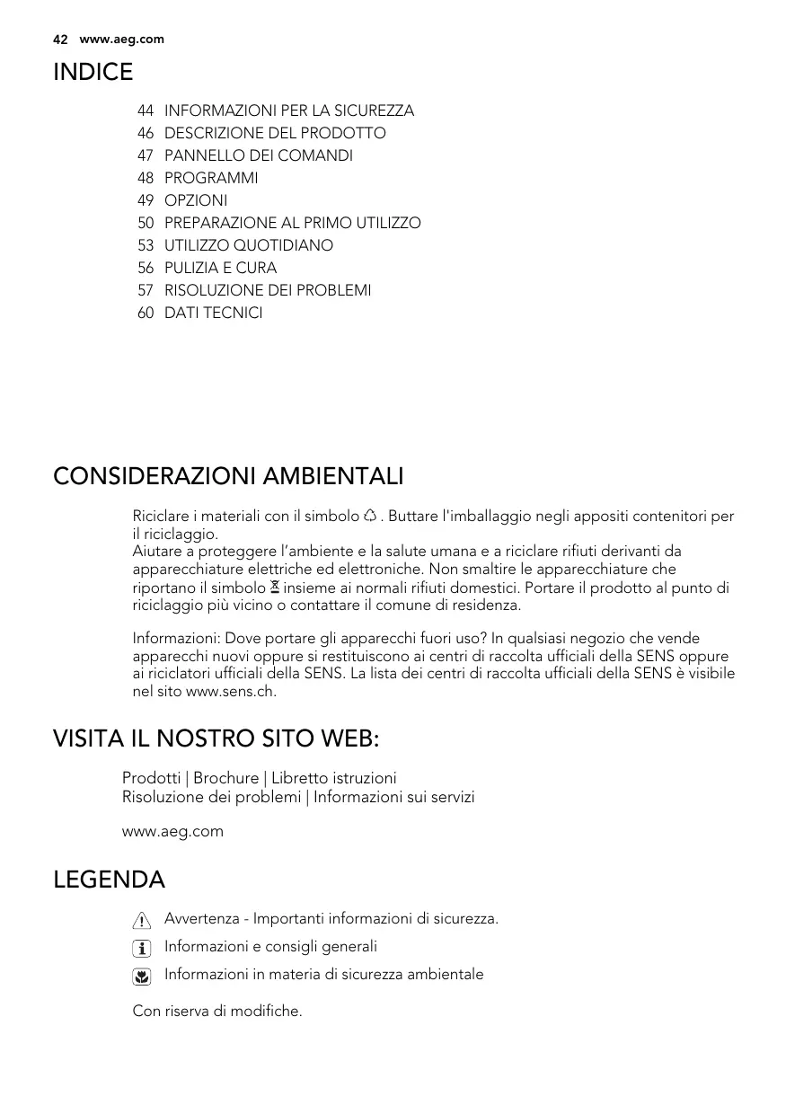 DATI TECNICI CONSIDERAZIONI AMBIENTALI Riciclare i materiali con il simbolo . Buttare l'imballaggio negli appositi contenitori per il riciclaggio. Aiutare a proteggere l’ambiente e la salute umana e a riciclare rifiuti derivanti da apparecchiature elettriche ed elettroniche. Non smaltire le apparecchiature che riportano il simbolo insieme ai normali rifiuti domestici. Portare il prodotto al punto di riciclaggio più vicino o contattare il comune di residenza. Informazioni: Dove portare gli apparecchi fuori uso? In qualsiasi negozio che vende apparecchi nuovi oppure si restituiscono ai centri di raccolta ufficiali della SENS oppure ai riciclatori ufficiali della SENS. La lista dei centri di raccolta ufficiali della SENS è visibile nel sito www.sens.ch. VISITA IL NOSTRO SITO WEB: Prodotti | Brochure | Libretto istruzioni Risoluzione dei problemi | Informazioni sui servizi www.aeg.com LEGENDA Avvertenza - Importanti informazioni di sicurezza. Informazioni e consigli generali Informazioni in materia di sicurezza ambientale Con riserva di modifiche. ITALIANO
