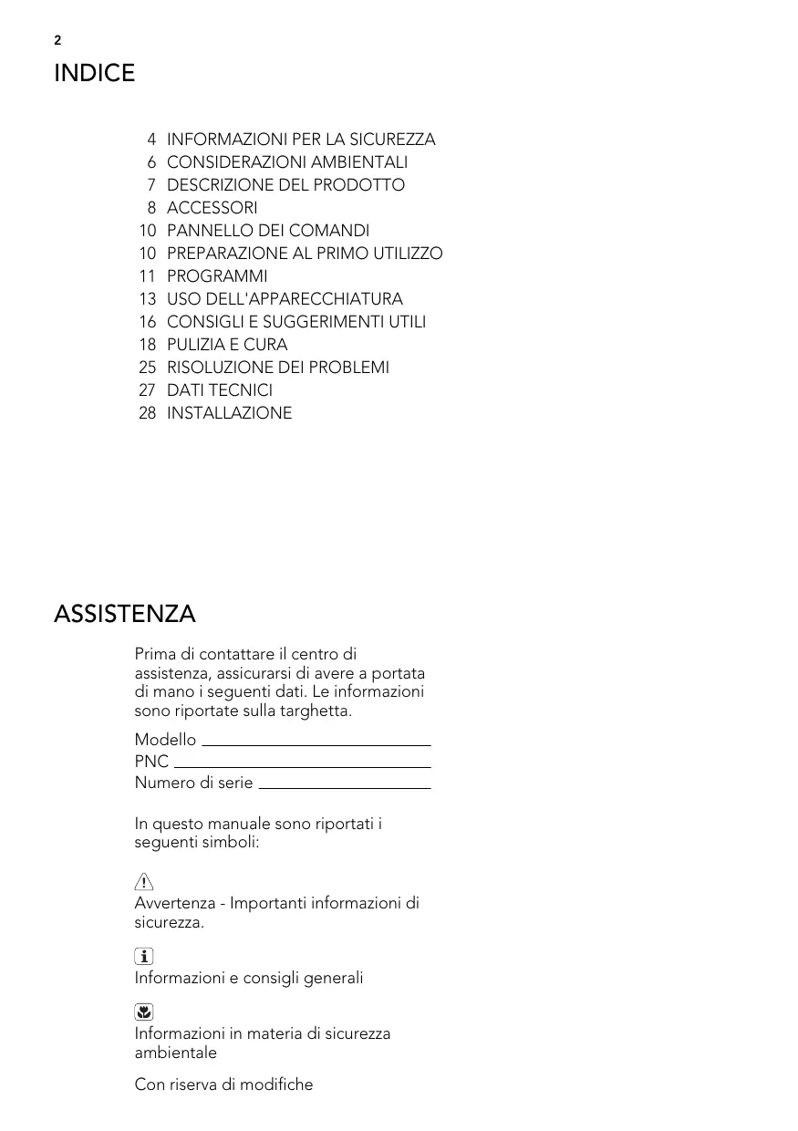 27 DATI TECNICI 28 INSTALLAZIONE ASSISTENZA Prima di contattare il centro di assistenza, assicurarsi di avere a portata di mano i seguenti dati. Le informazioni sono riportate sulla targhetta. Modello PNC Numero di serie In questo manuale sono riportati i seguenti simboli