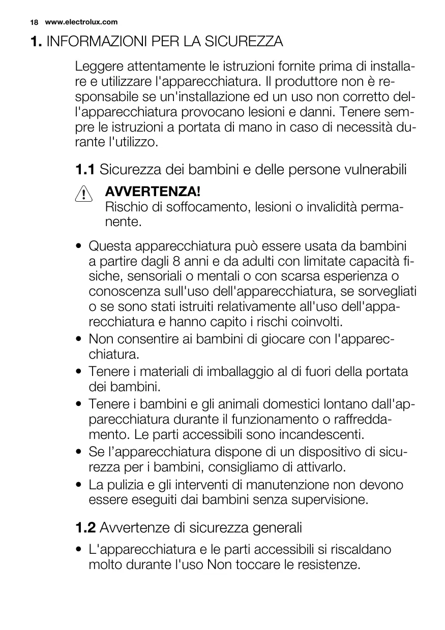 - Questa apparecchiatura può essere usata da bambini a partire dagli 8 anni e da adulti con limitate capacità fisiche, sensoriali o mentali o con scarsa esperienza o conoscenza sull'uso dell'apparecchiatura, se sorvegliati o se sono stati istruiti relativamente all'uso dell'apparecchiatura e hanno capito i rischi coinvolti.