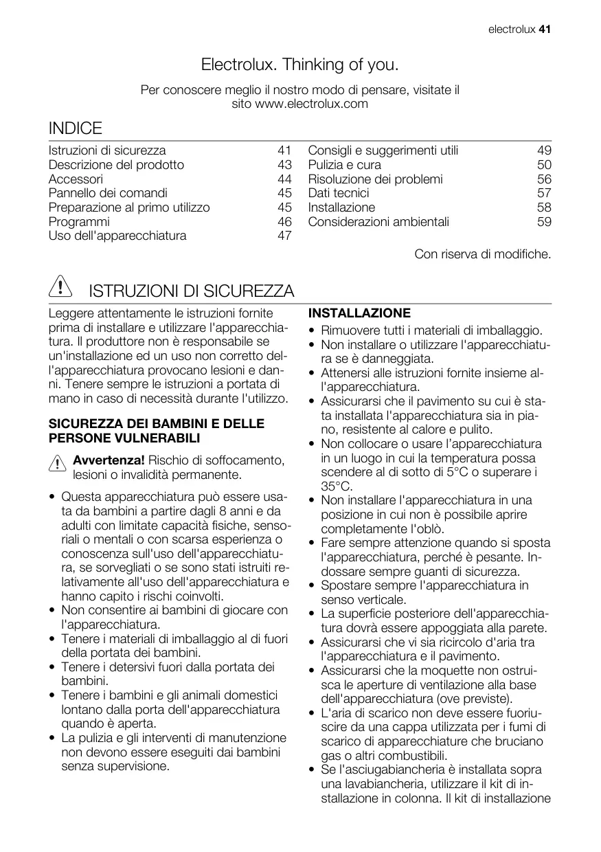 . ButRiciclare i materiali con il simbolo tare l'imballaggio negli appositi contenitori per il riciclaggio. 60 electrolux Electrolux. Thinking of you. Share more of our thinking at www.electrolux.com CONTENTS Safety instructions Product description Accessories Control panel Before first use Programmes Using the appliance