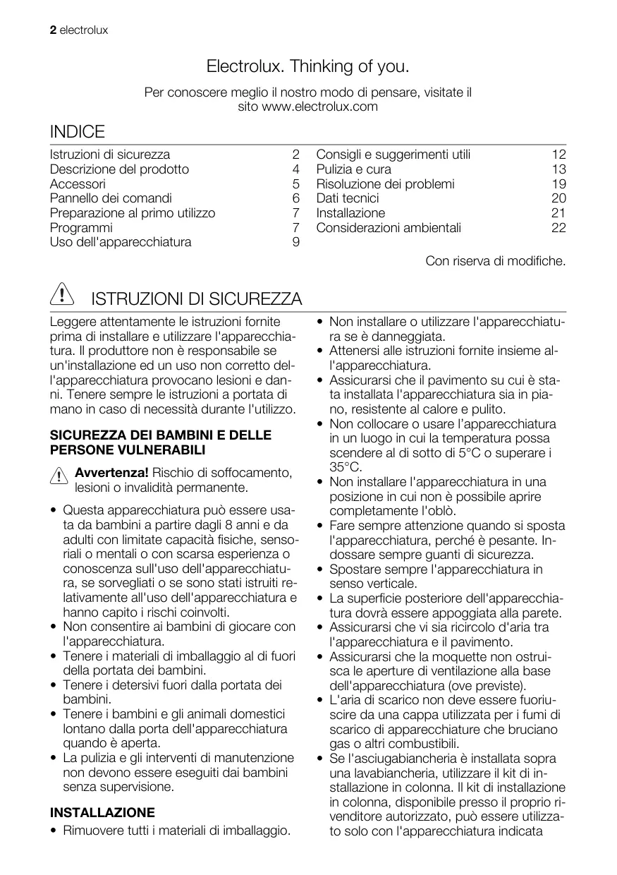 2 electrolux Electrolux. Thinking of you. Per conoscere meglio il nostro modo di pensare, visitate il sito www.electrolux.com INDICE Istruzioni di sicurezza Descrizione del prodotto Accessori Pannello dei comandi Preparazione al primo utilizzo Programmi Uso dell'apparecchiatura CREOTOENN